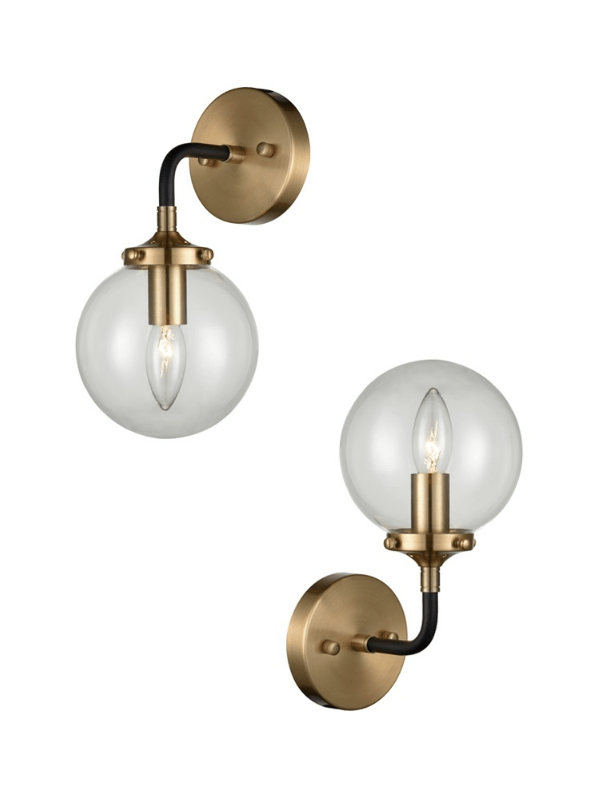 1 light Fitting in matt black and antique gold finish with clear glass sphere.