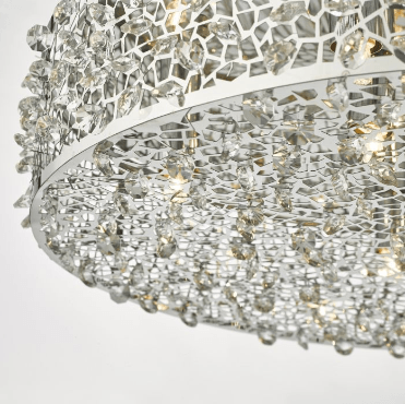 Flush ceiling light in a polished chrome finish, featuring faceted crystal beads which sit between stainless steel laser cut metalwork.