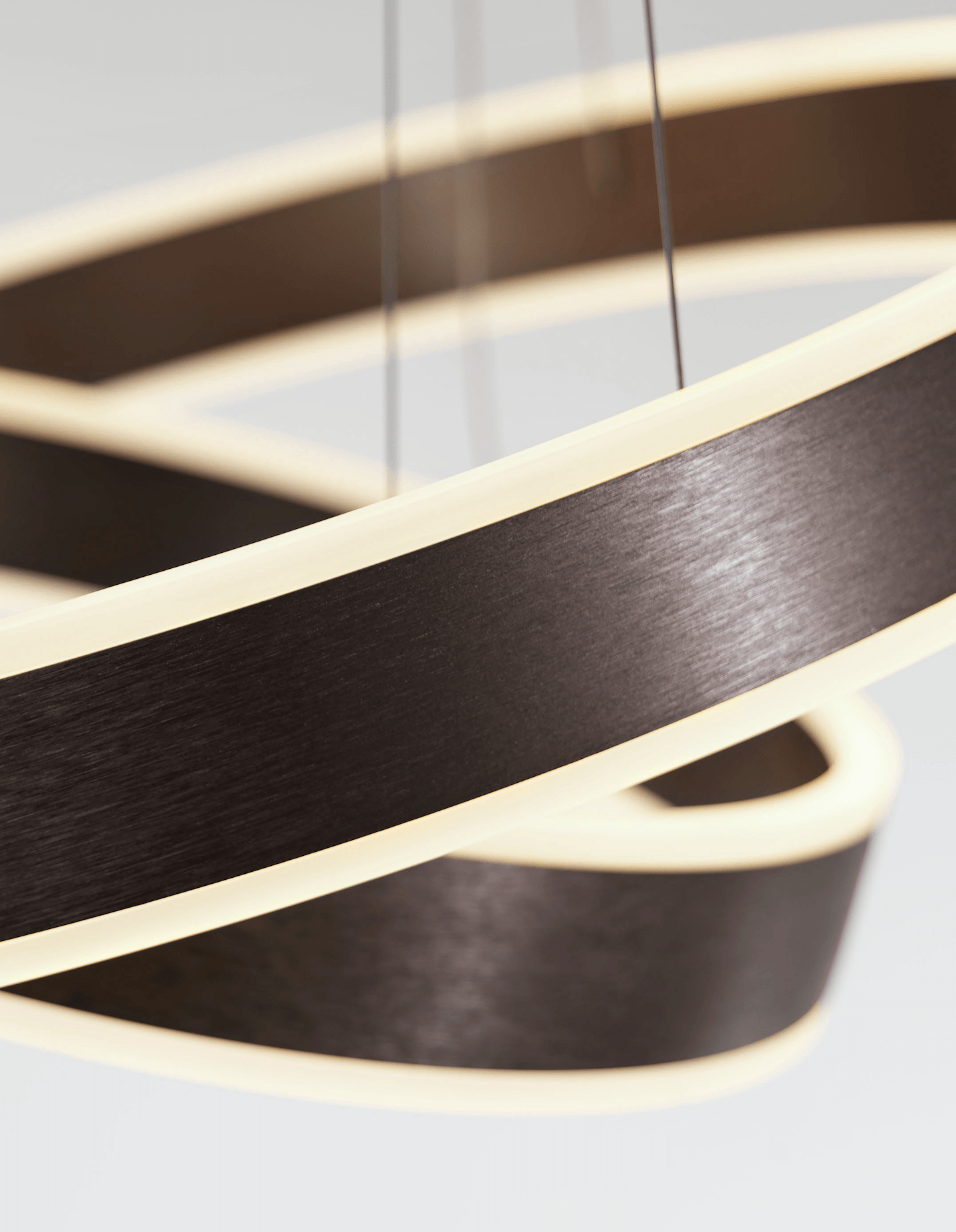 Each bronze hoop features an acrylic edge to produce a diffused light distribution.