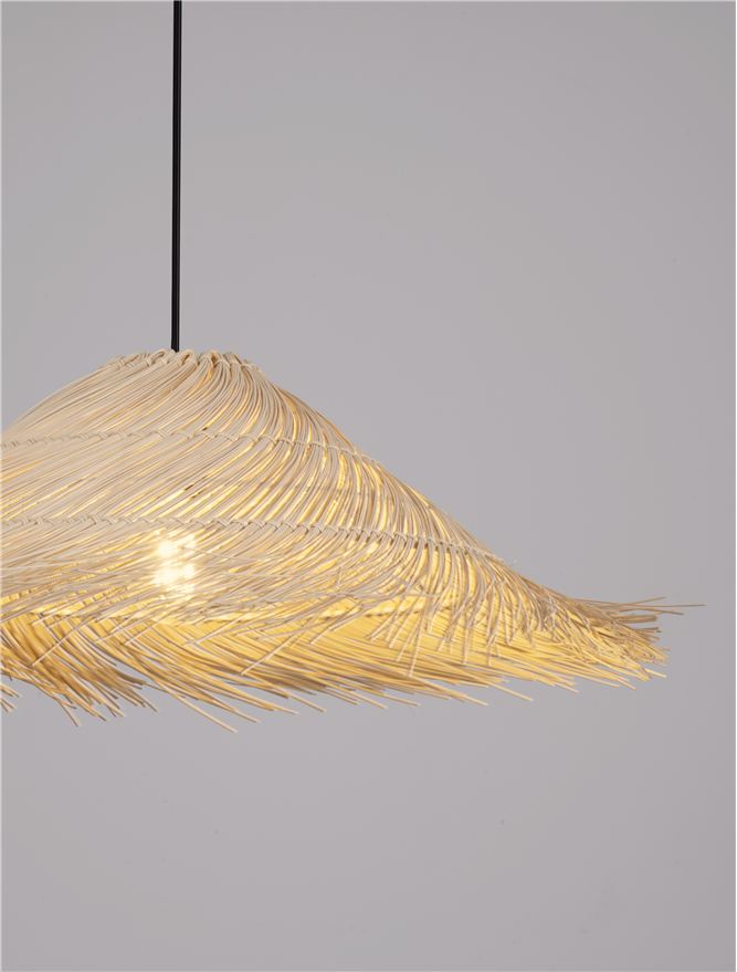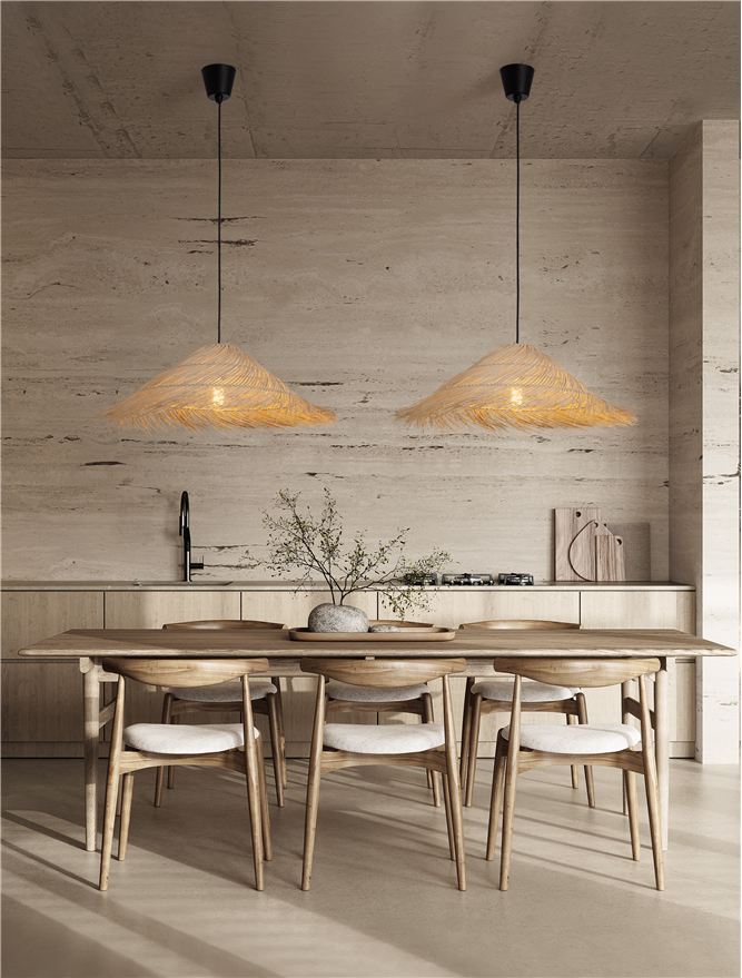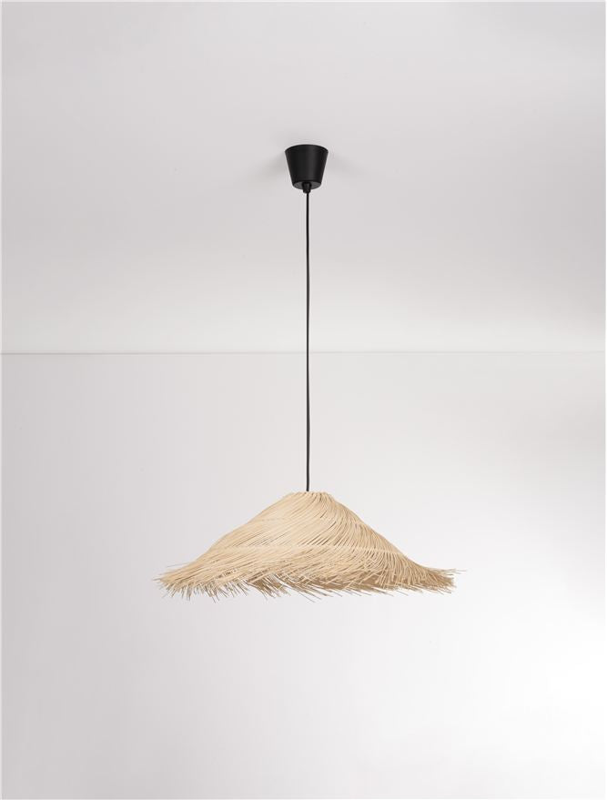 A Natural, organic conical shaped pendant made with rattan and a matching Sandy black metal conical ceiling rose.