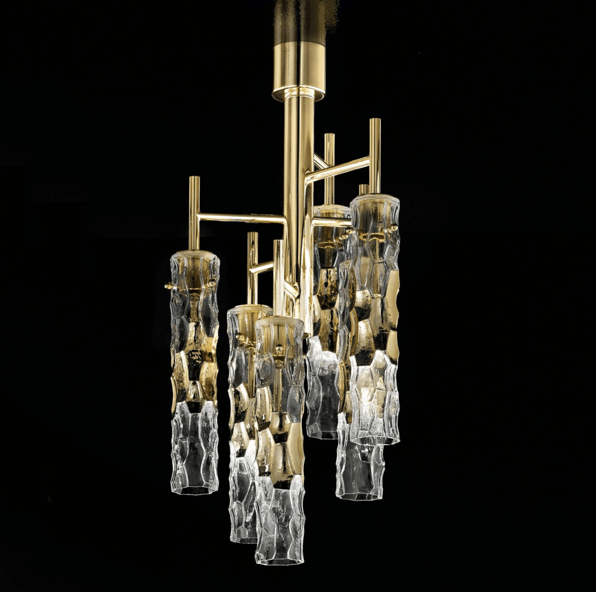 The glass tubes are manufactured from Murano glass and worked in a hammered effect with a metalized decorative band in chrome or 24kt gold, or satin black nickel.