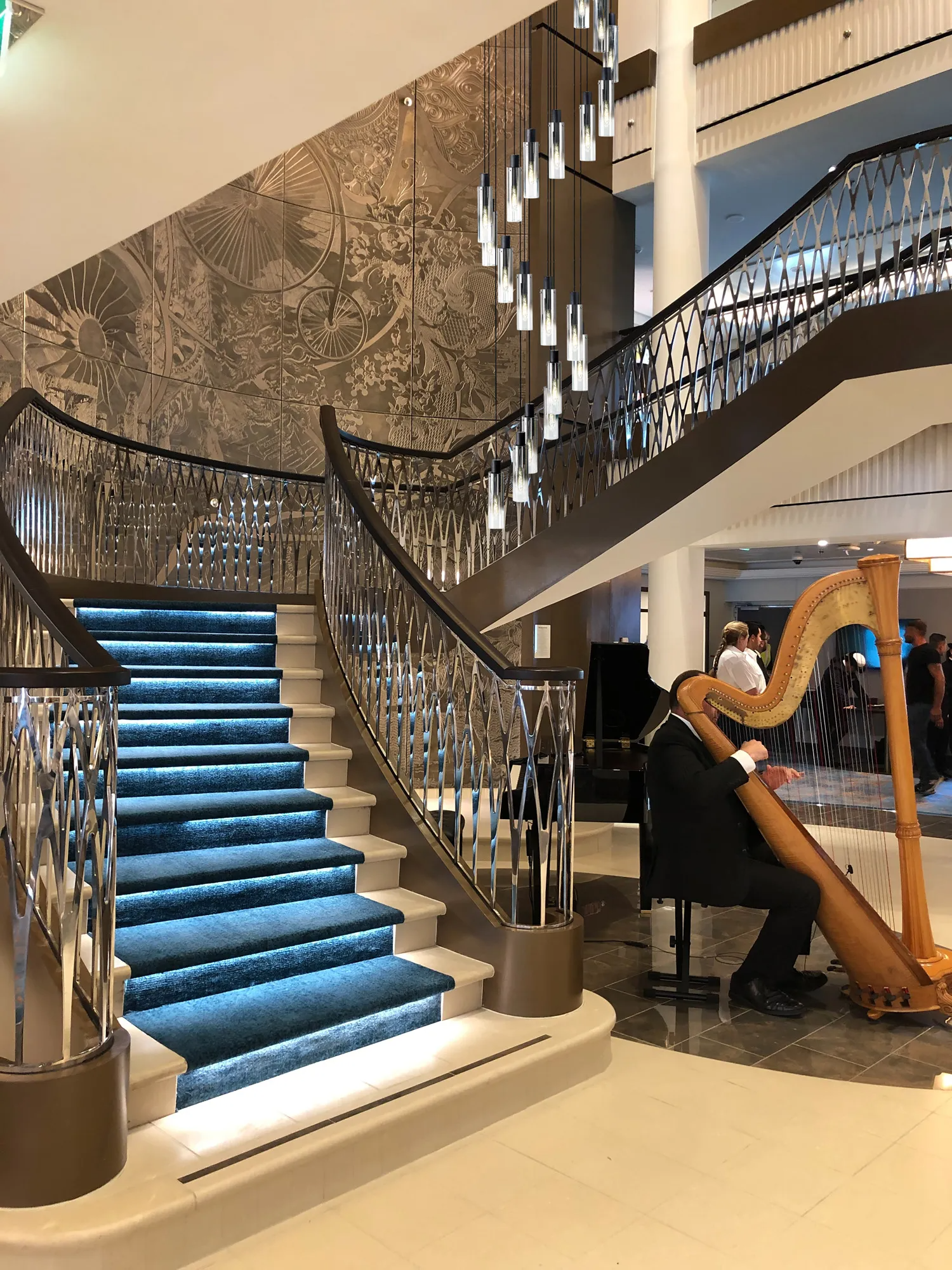 Custom bespoke stairwell pendant with Black lamp holders and black with polished chrome ceiling rose. Available with a custom drop starting at 5.4 Metres, bespoke to your required length.