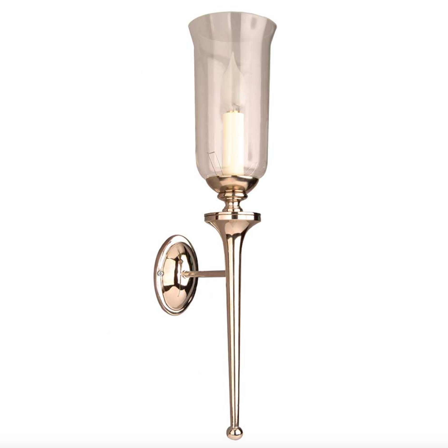 A single wall light with clear storm glass made of solid cast brass which is finished in Polished Nickel.
