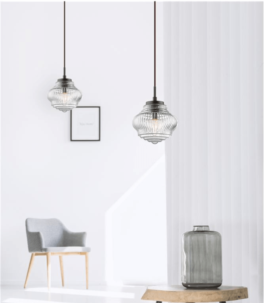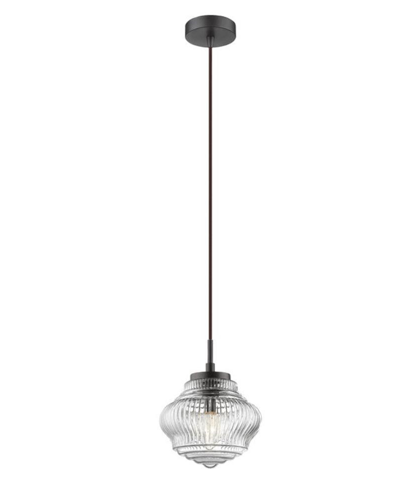 An elegant single pendant featuring textured glass which is finished with a brown ceiling rose & brown fabric wire.