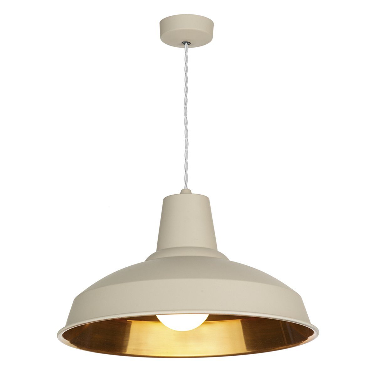 Handcrafted industrial style single pendant in a cream finish, featuring a copper inner effect and cream braided cable.