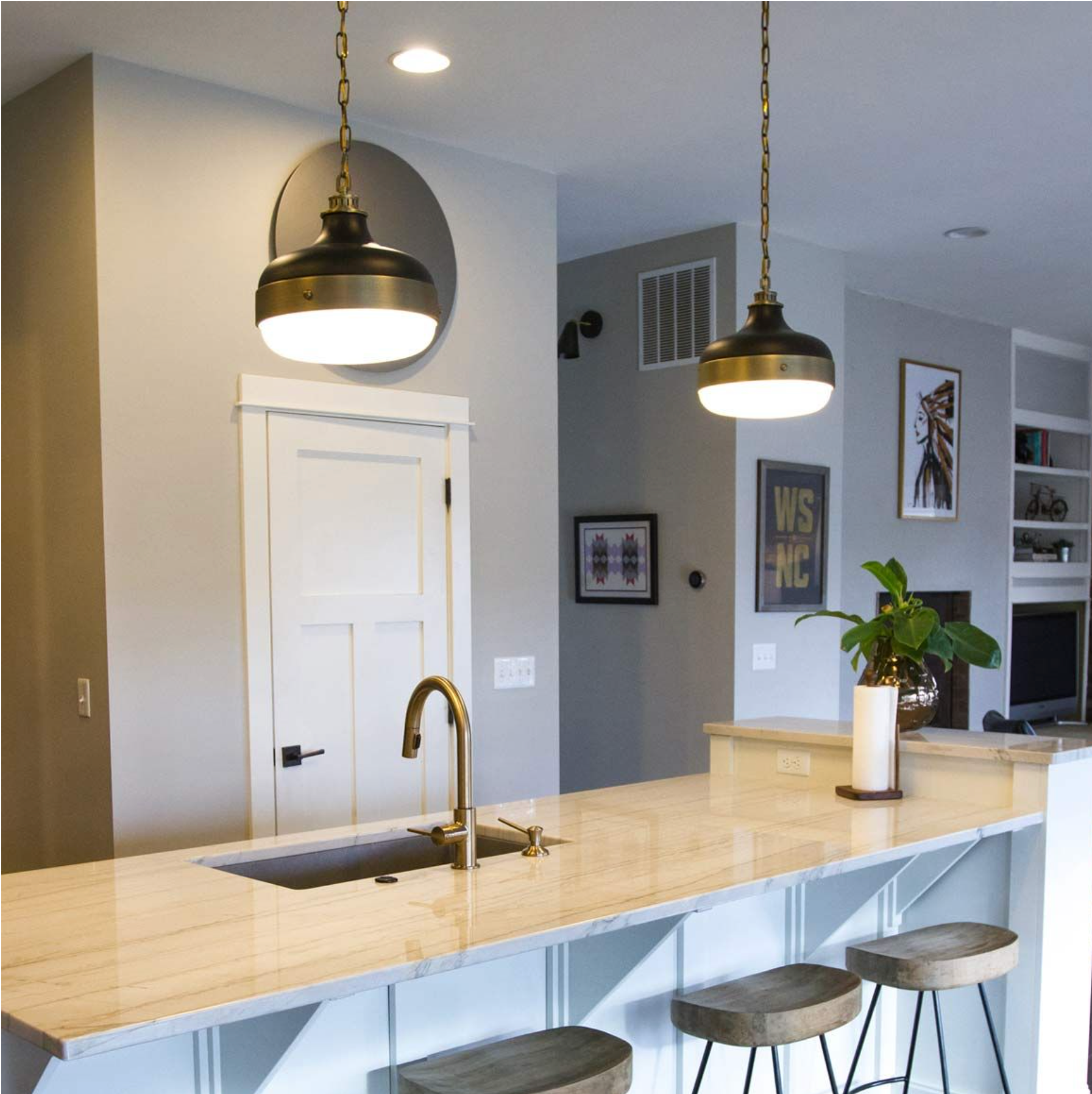 Dark Antique Brass / Matte Black. Harking back to period-inspired, warehouse lighting, this collection is a contemporary update to historic industrial fixtures. The riveted centre band, as well as the vented top and square-linked chain on the pendants add rich, visual interest yet don't distract from the clean lines of the overall silhouette. Also available in Polished Nickel/Brushed Steel finish. Also smaller size option.