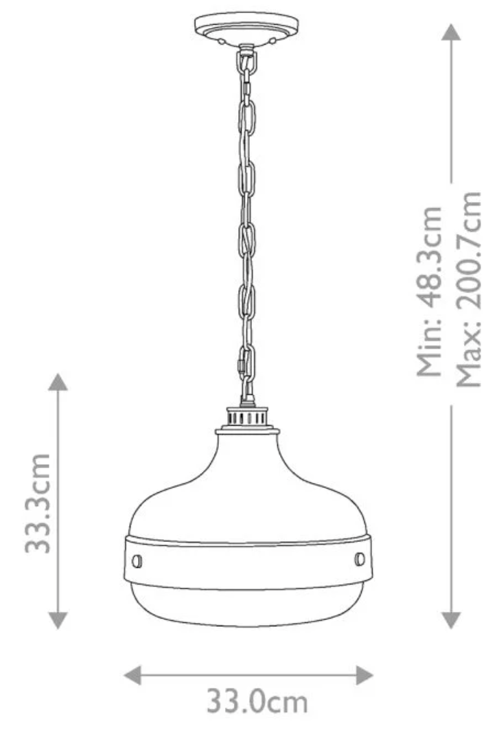Fitting Height: 333mm x Diameter: 330mm x Min-max drop 483mm - 2007mm.