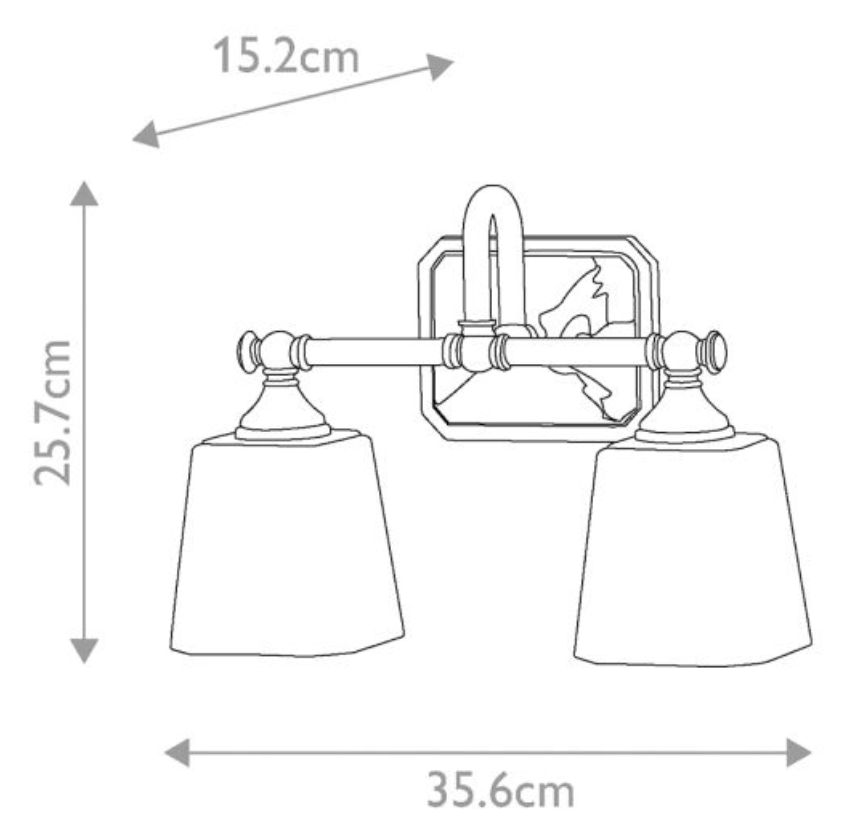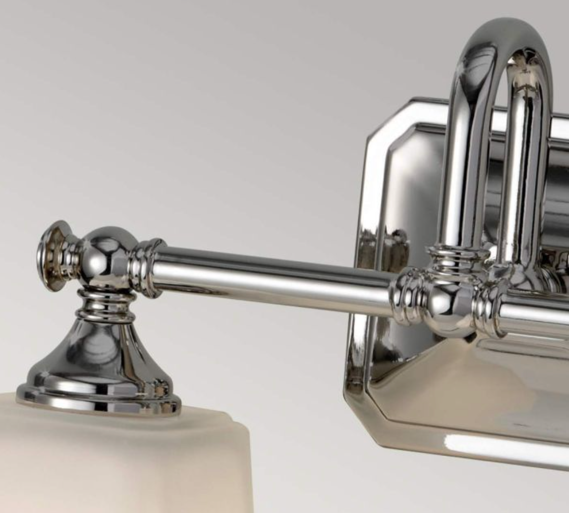 This classic above mirror polished chrome IP44 wall light features a goose-neck arm, leading to four-sided, opal-etched glass shades with bevelled corners and a cleanly chamfered back plate with a cut corner detail. Ideal for bathrooms.