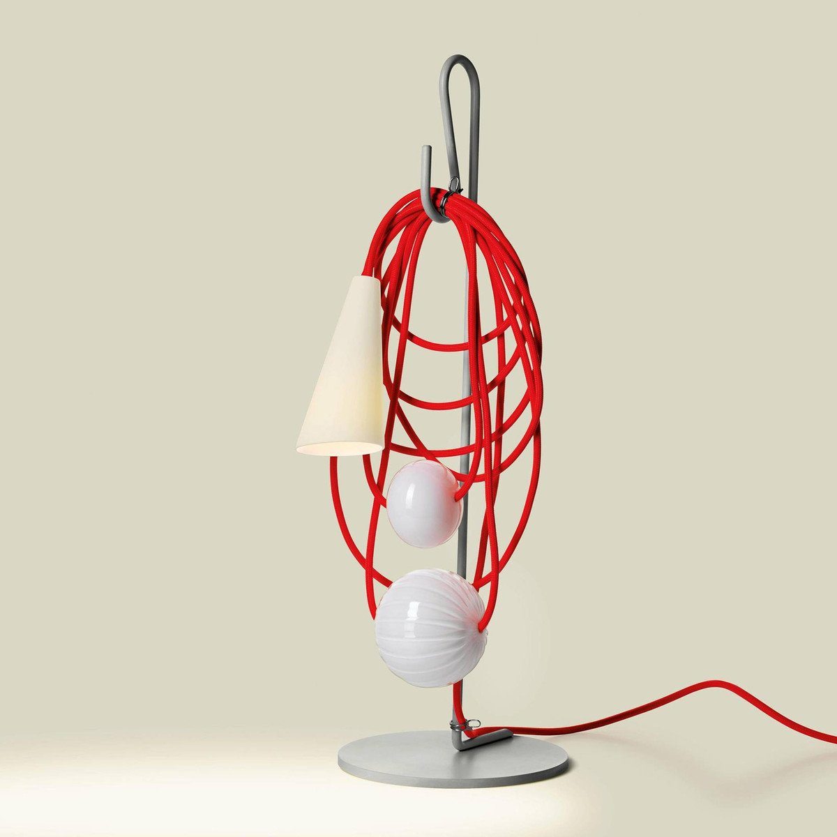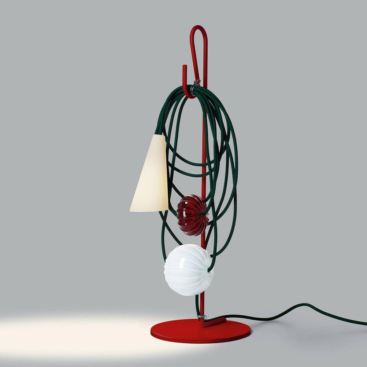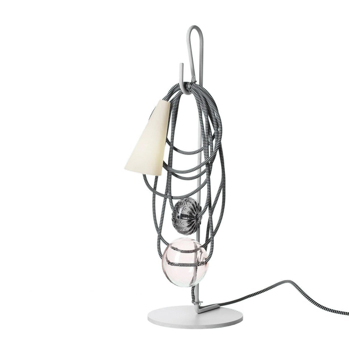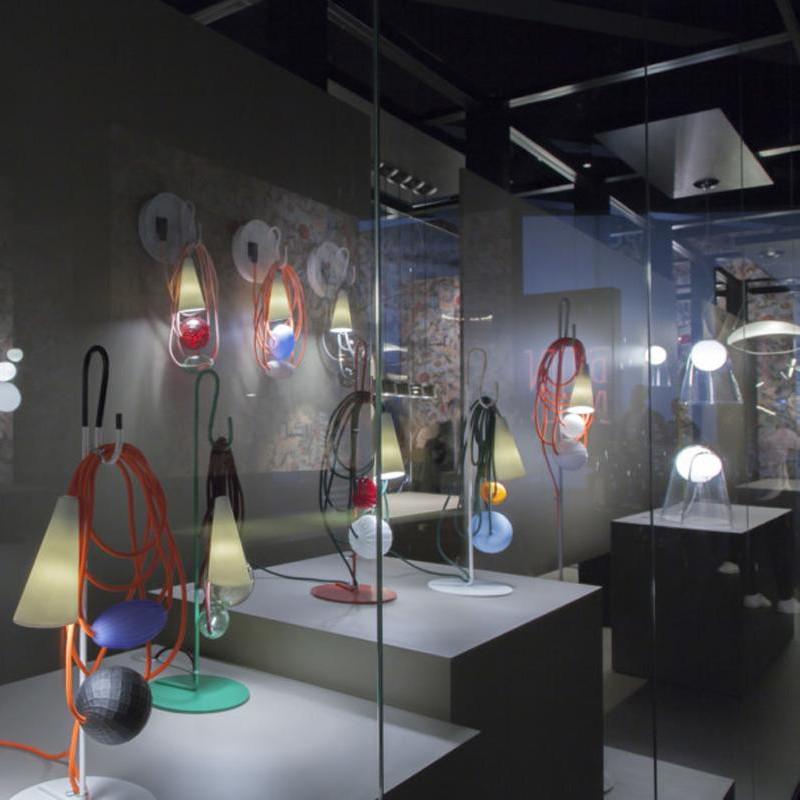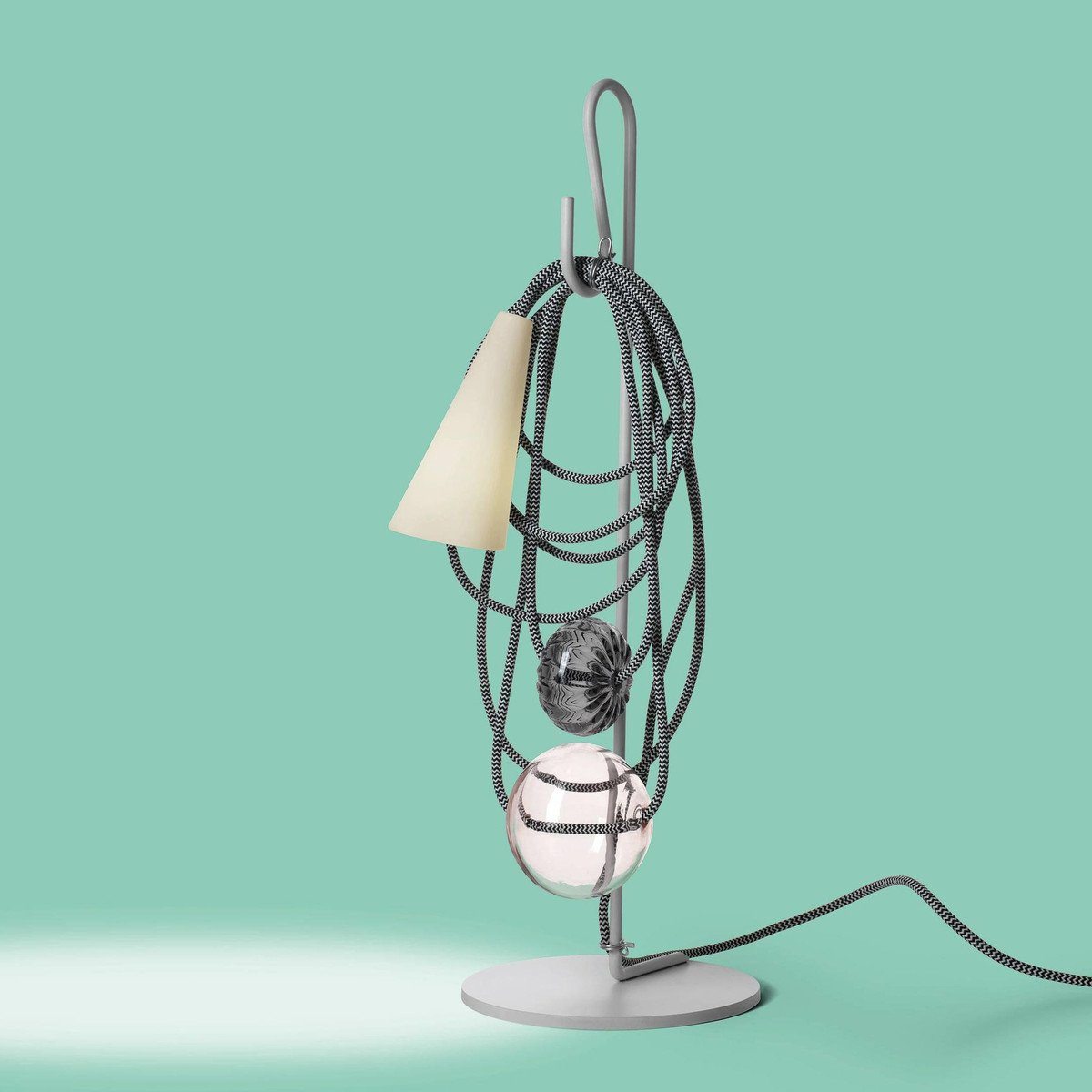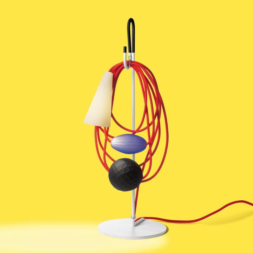 Hence the electrical wire establishes a dialogue with the parts in glass and the diffuser, in a rhythmical game of role swapping. While the energy that allows the lamp to perform its purpose as lighting runs along the cord, spheres and bulbs of glass also take their place there, transforming it into the archetype of a necklace, with a porcelain body in the form of a cone that projects the light on the wire and the glass spheres, ideally positioned as a pendent.