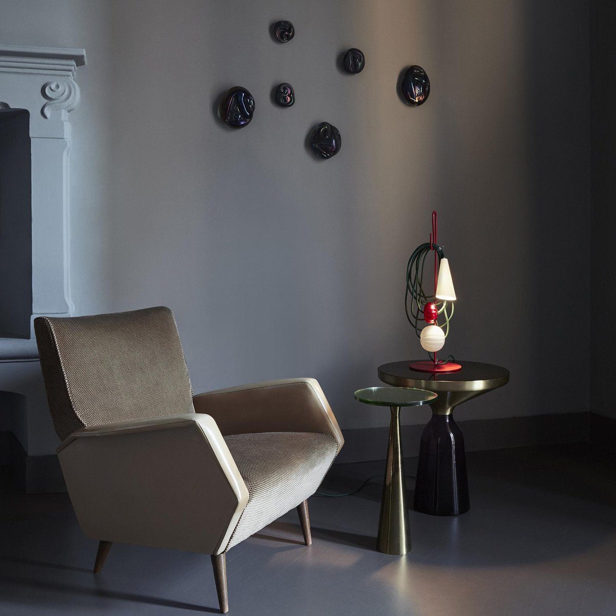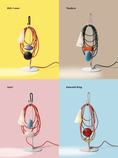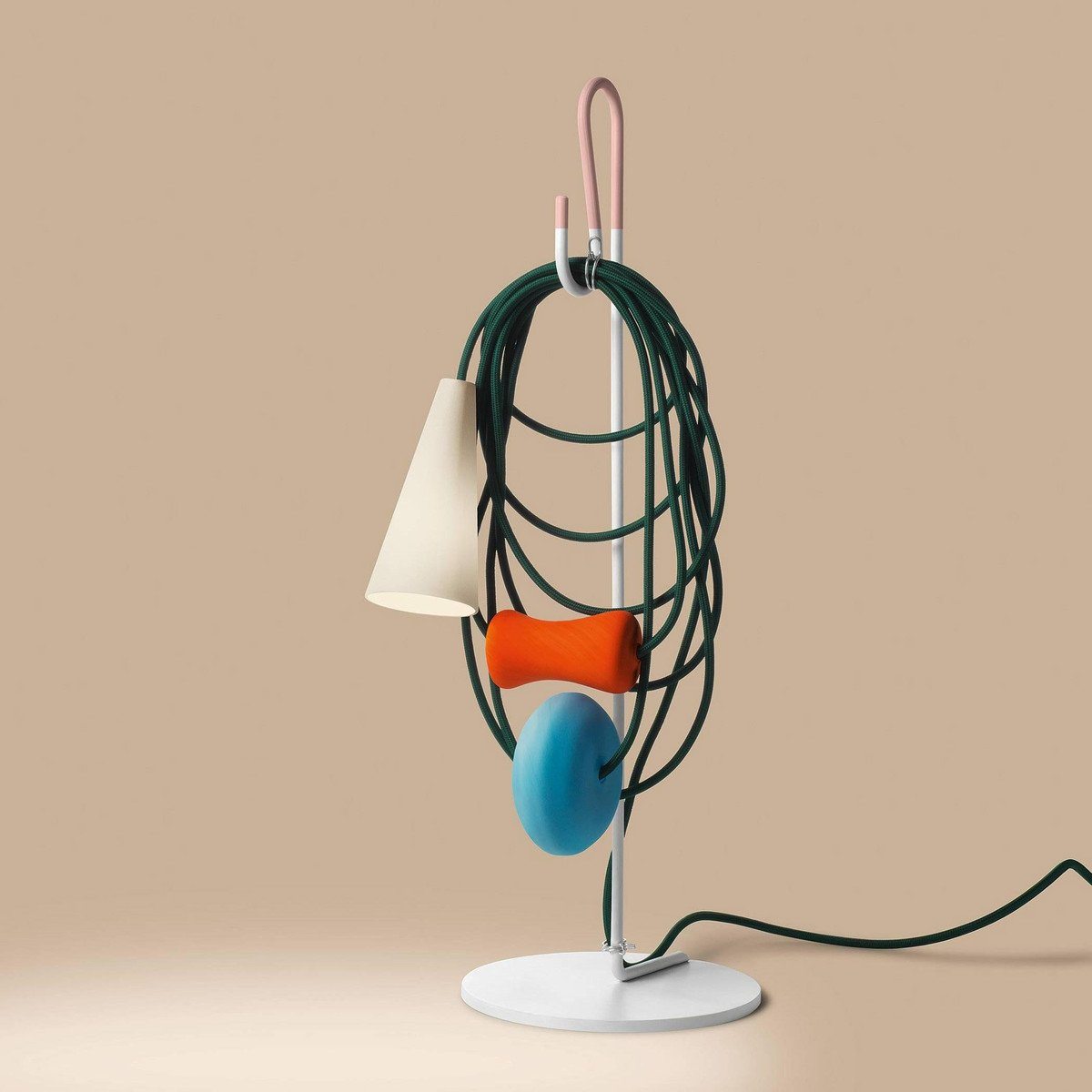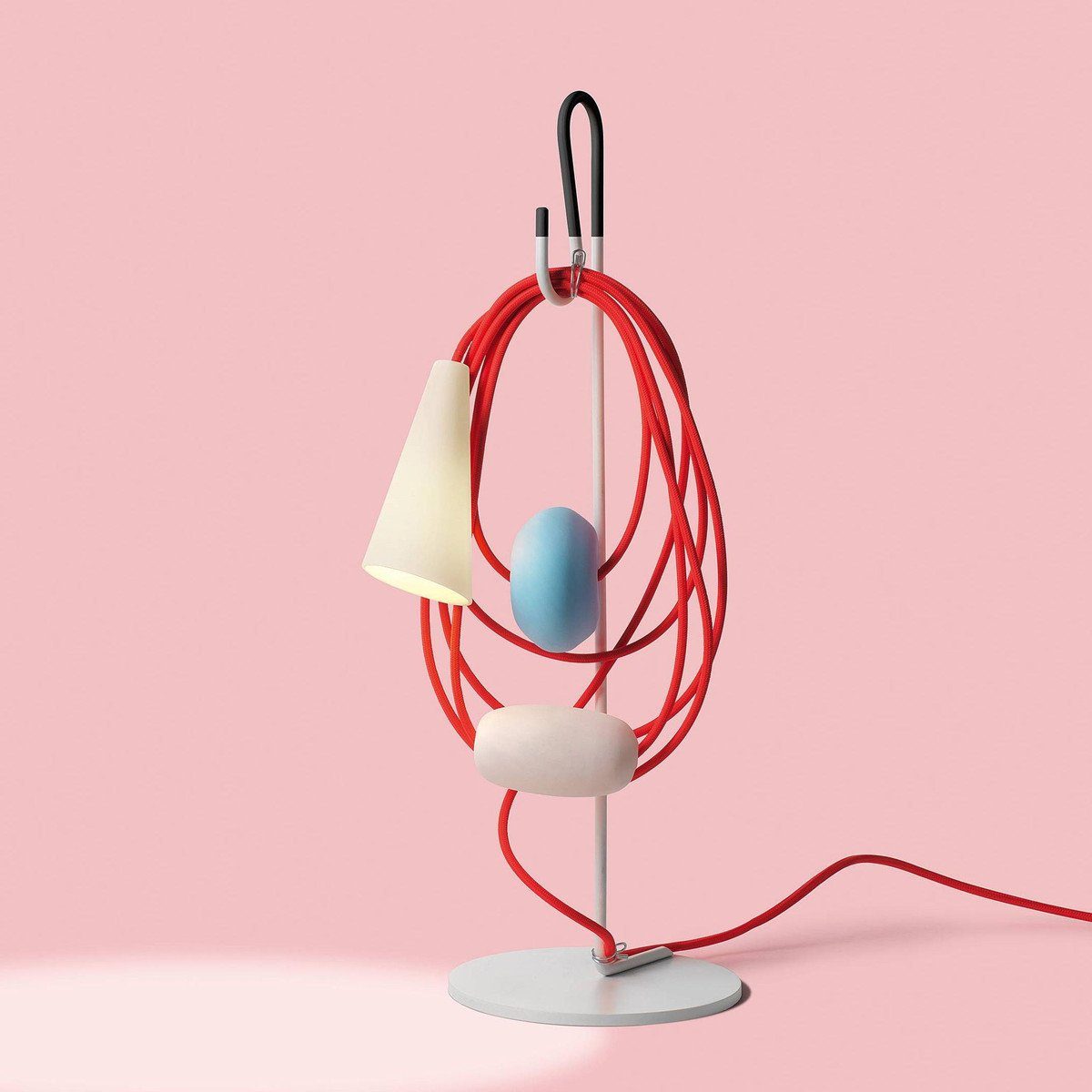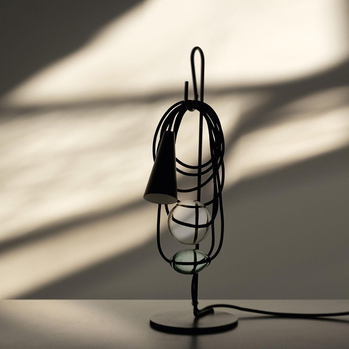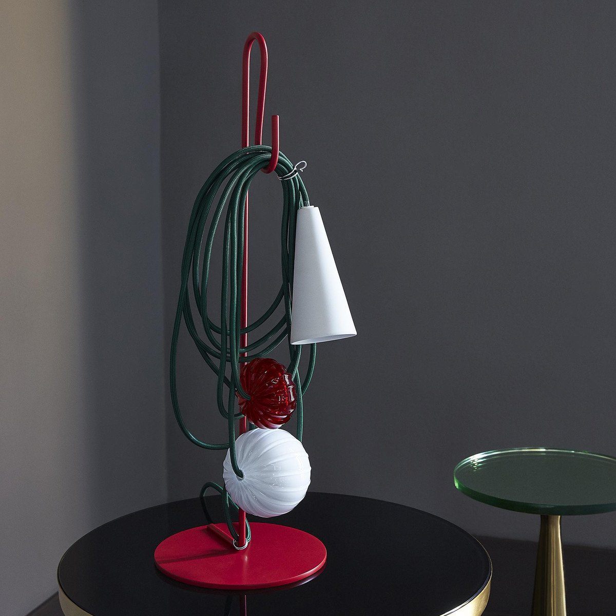 Hence the electrical wire establishes a dialogue with the parts in glass and the diffuser, in a rhythmical game of role swapping. While the energy that allows the lamp to perform its purpose as lighting runs along the cord, spheres and bulbs of glass also take their place there, transforming it into the archetype of a necklace, with a porcelain body in the form of a cone that projects the light on the wire and the glass spheres, ideally positioned as a pendent.