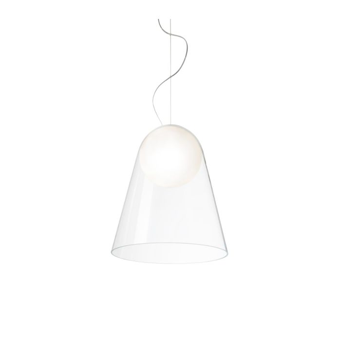 A poetic, surprising design made completely in handcrafted blown glass. The white frosted diffuser is inserted in a transparent body that seems to levitate the luminous core and capture its light as if by magic. The lamp transmits warm, soft light, completely without glare.