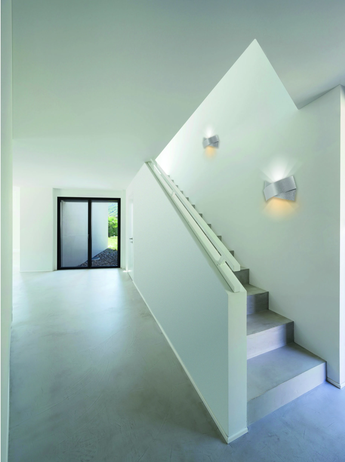 Calimero by Grossmann is a contemporary wall light featuring two pieces of overlapping brushed aluminium metalwork. The outer panel can be rotated to adjust the appearance. Designed to cast a pool of warm white LED light up and down your wall.