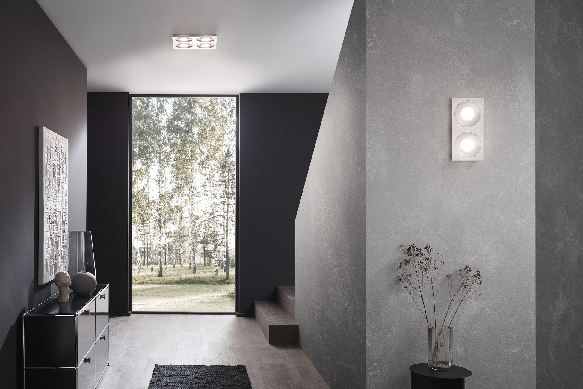 For ceilings & walls, as background or accent lighting, in black or silver. COAX can be integrated into any room concept. A refined aluminium ring per module caress the lighting optics of the exceptional flat luminaire. Two, three or four light optics in a row form a design unit horizontally or vertically. Alternatively, a square multiple provides targeted light in the dark.
