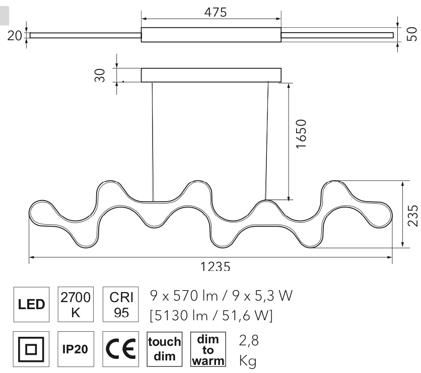 Including integral 9 x LED modules 570 lumen (5130 Lumen total) | 51.6 Total Watt | 2700 K warm white | CRI 95