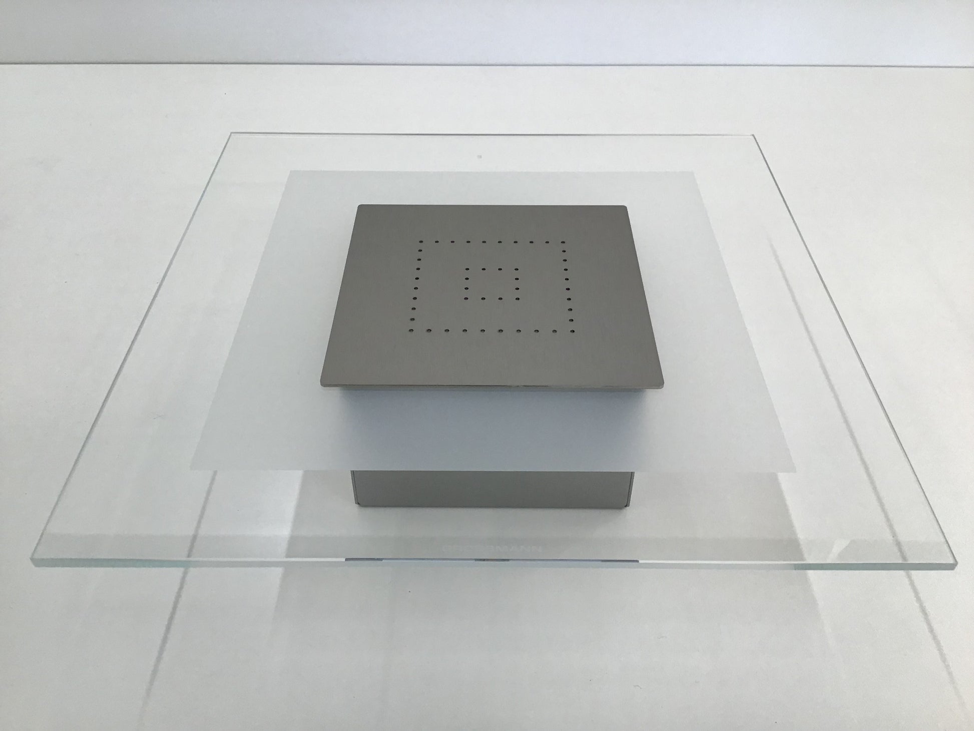 Homogenous extravagance. The square metal application fits perfectly into the geometry of the partially satin-finished glass surface.