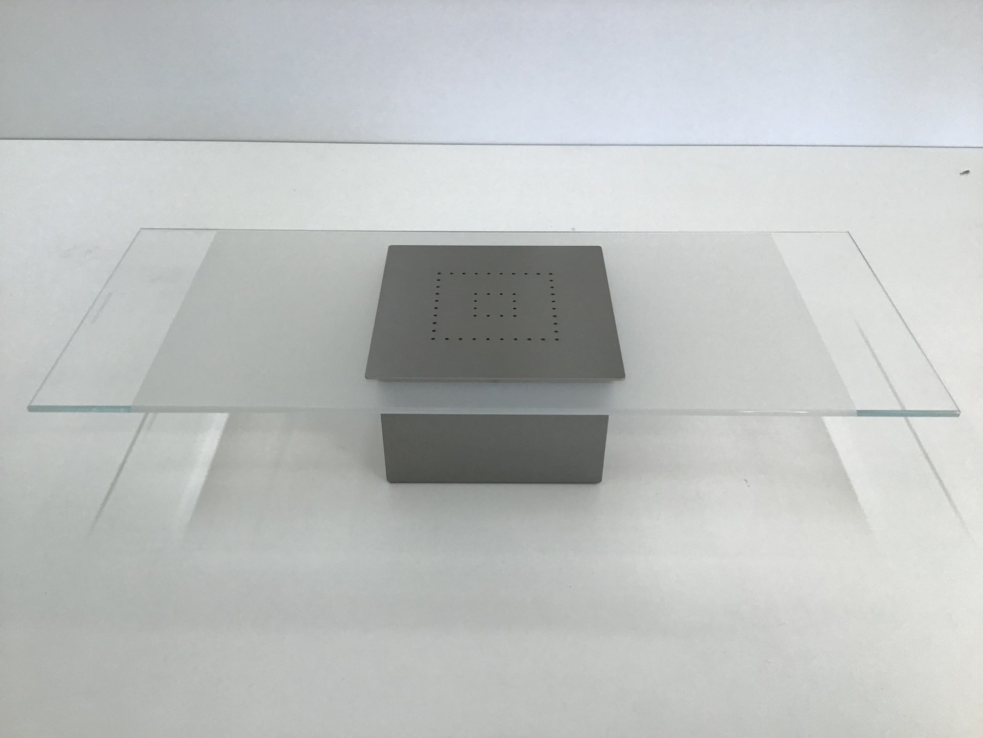Homogenous extravagance. The square metal application fits perfectly into the geometry of the partially satin-finished glass surface. A matt nickel front plate is perforated by tiny holes which add to the dramatic effect created by the up and down wash of light.