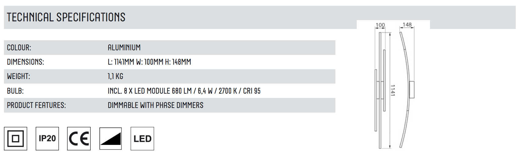 Dimensions: L: 1141mm W: 100mm H: 148mm