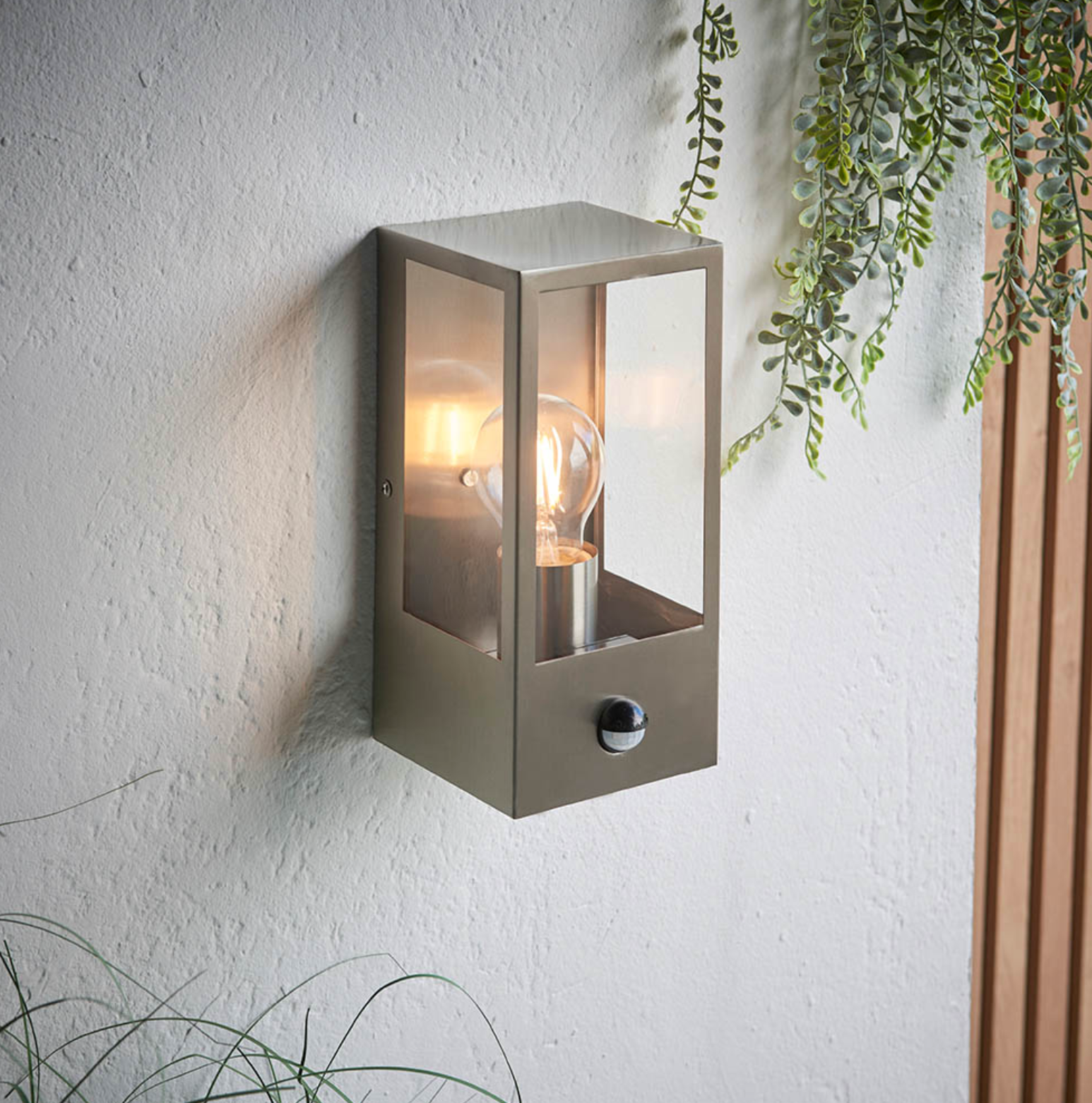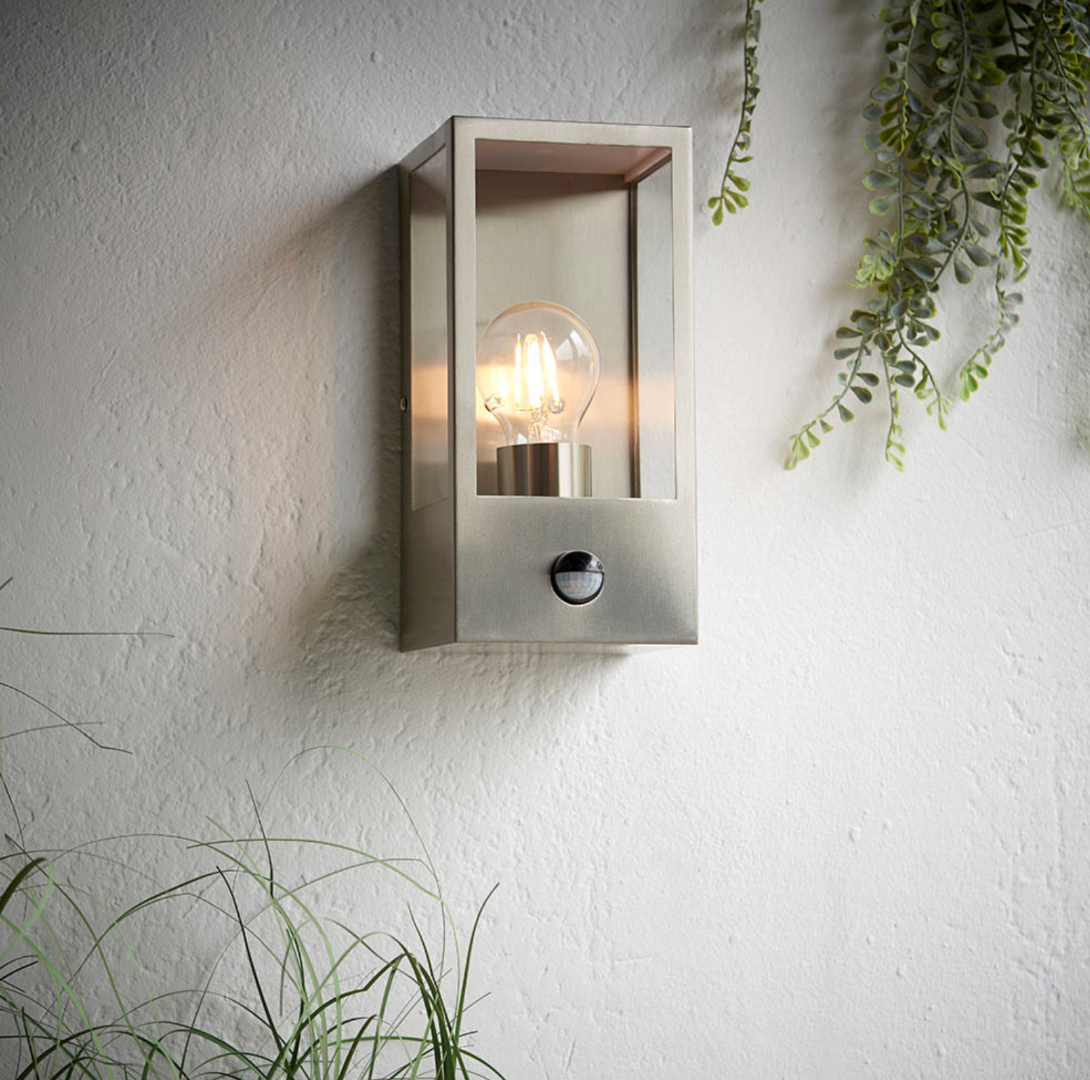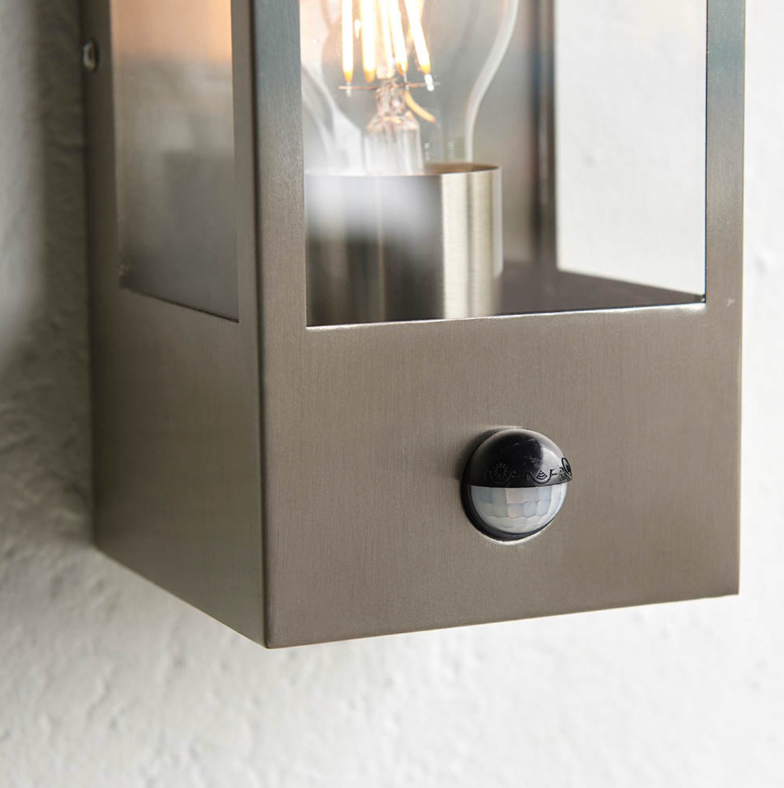 This box lantern with PIR, classic, timeless styling, in a brushed stainless steel finish. Featuring an integrated sensor that automatically switches the light on and off when movement is detected. The perfect addition to complement today's exterior architecture