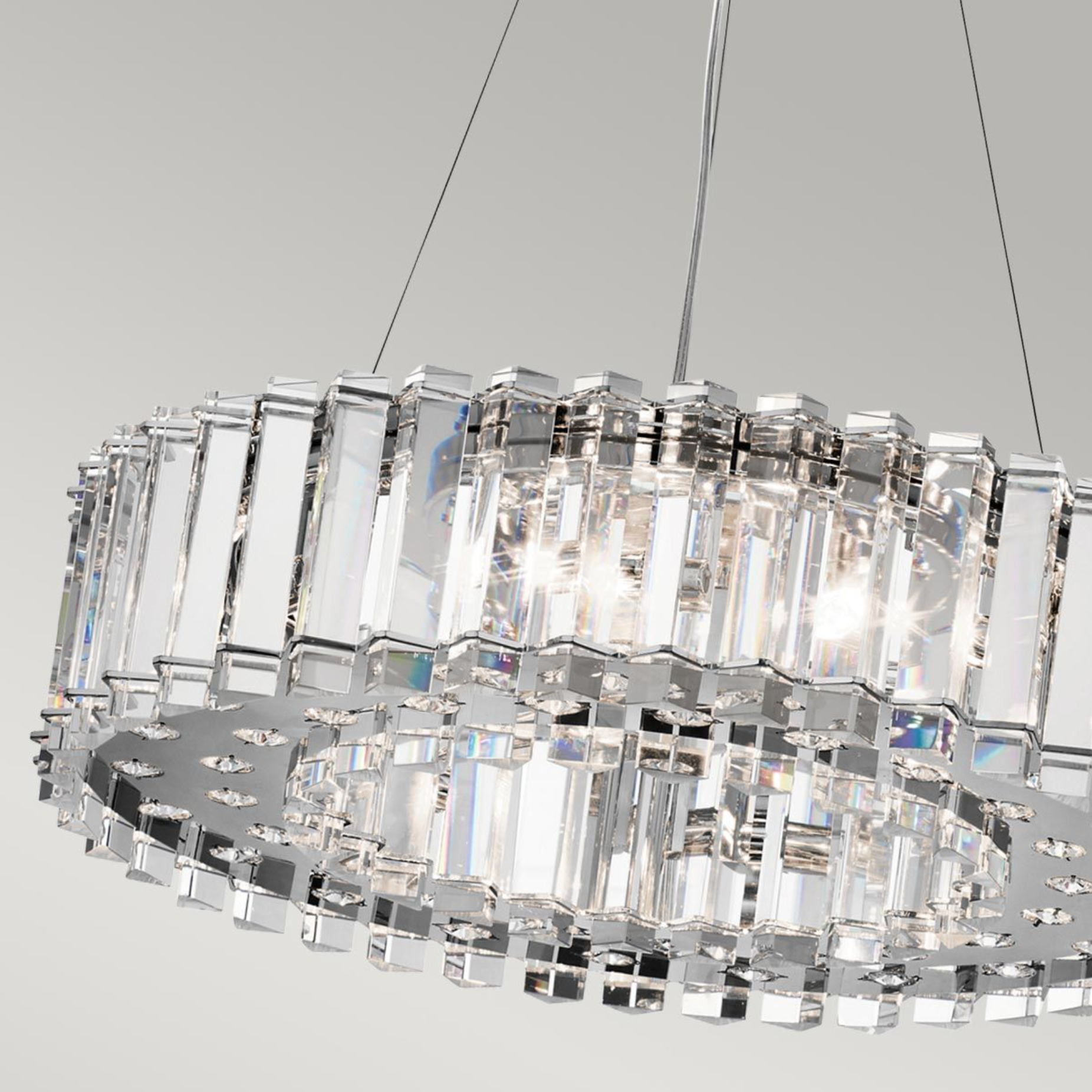 An unusual chandelier featuring triangular crystal prisms that rest inside polished chrome details and stand ready to reflect light in a hundred different ways. IP44 bathroom rated.