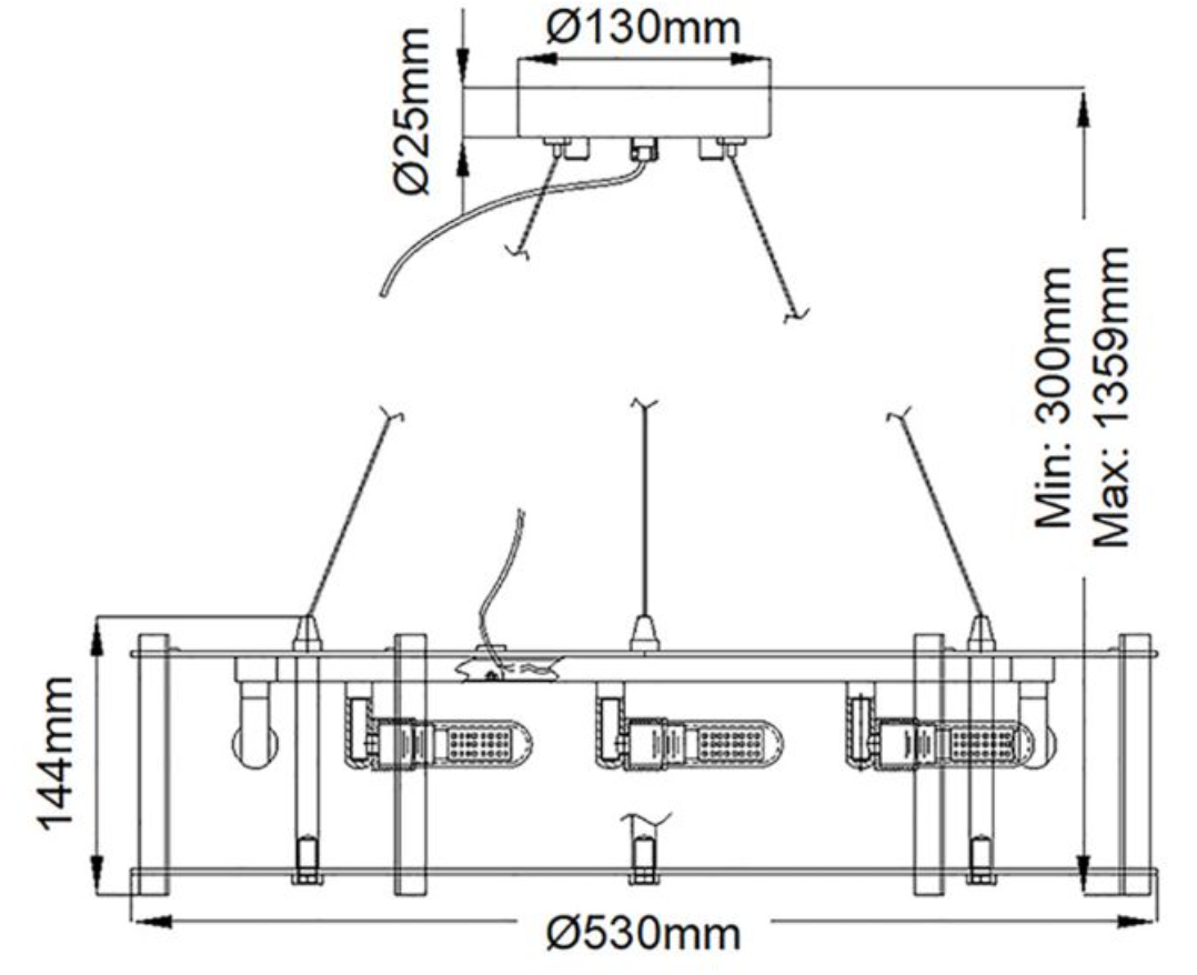 Height 127mm x diameter 527mm x max-min drop 1359-300mm.