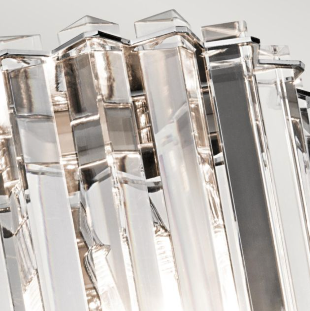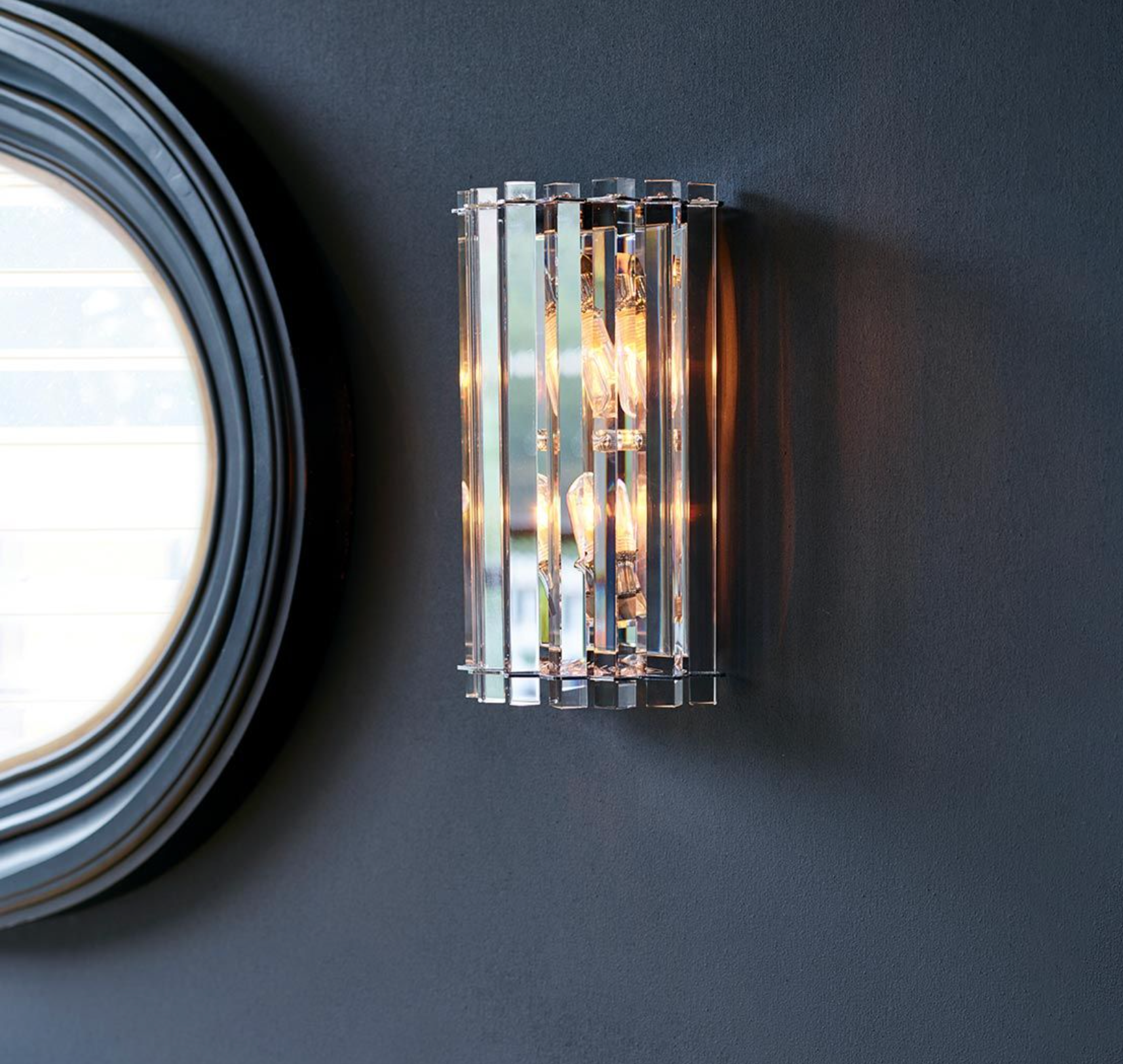 An unusual wall light featuring triangular crystal prisms that rest inside polished chrome details and stand ready to reflect light in a hundred different ways. Rounded crystals on the bottom reflect the inner light. IP44 suitable for bathroom zones 1 & 2.