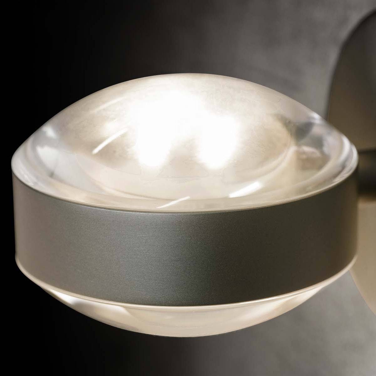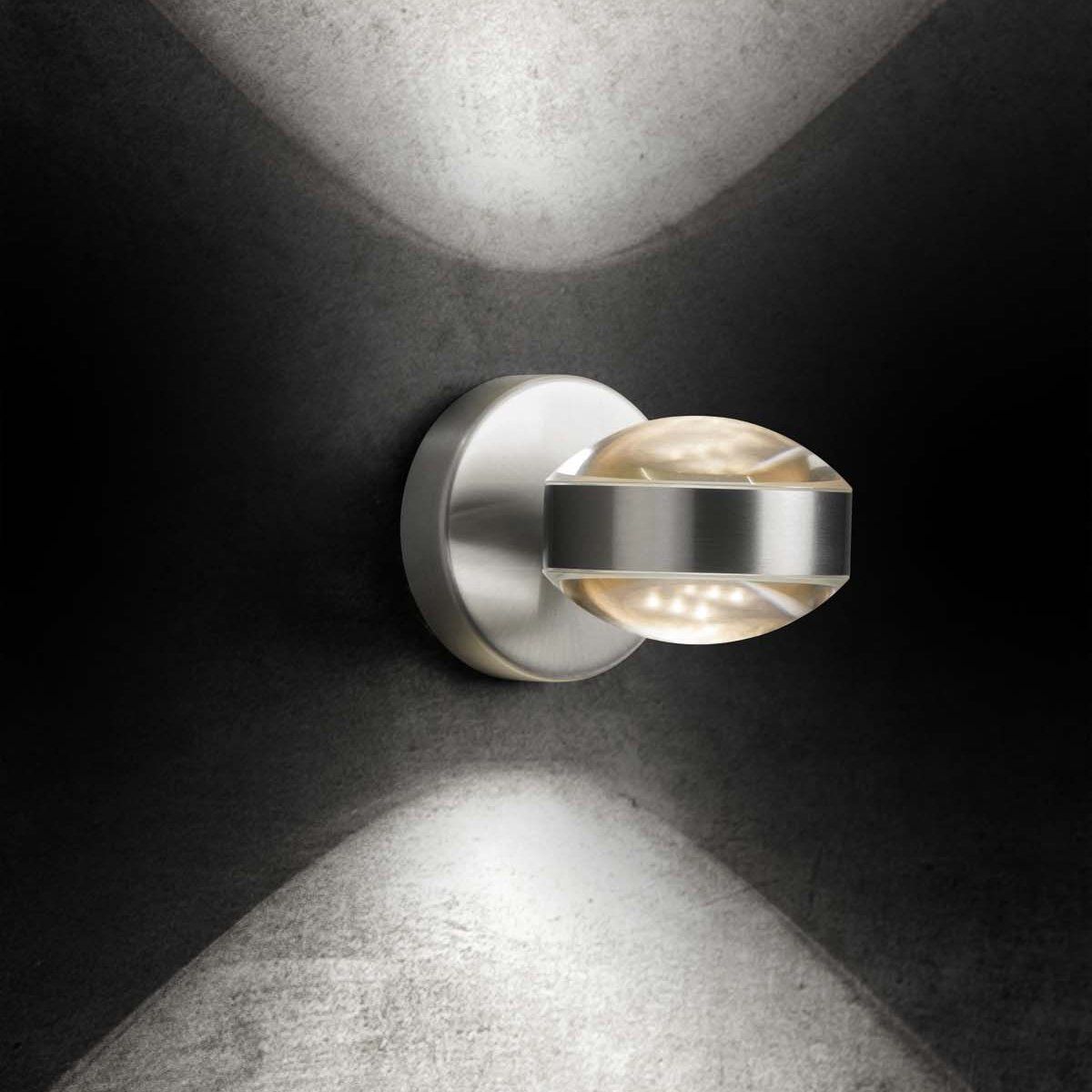 Modern wall light with a magnified optic which allows for a clean and focused wash of light up and down the wall.