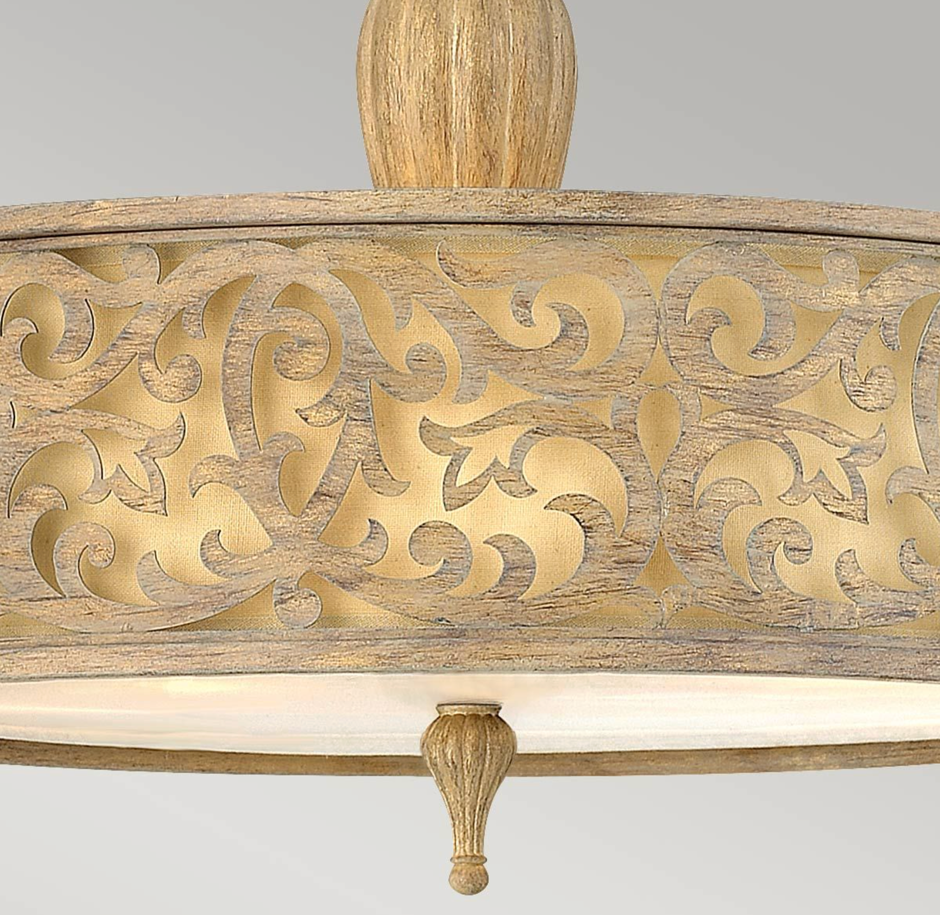 The flourishing pierced metalwork creates a stunning artistic design in a luxurious Brushed Champagne finish. The elegant scroll detail inset ivory linen shades and etched diffusers add to the beauty of this collection.