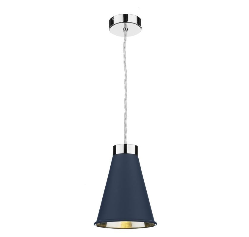Handcrafted single pendant in polished chrome and matt blue finish.