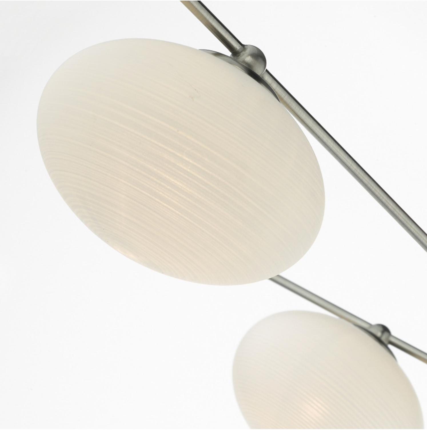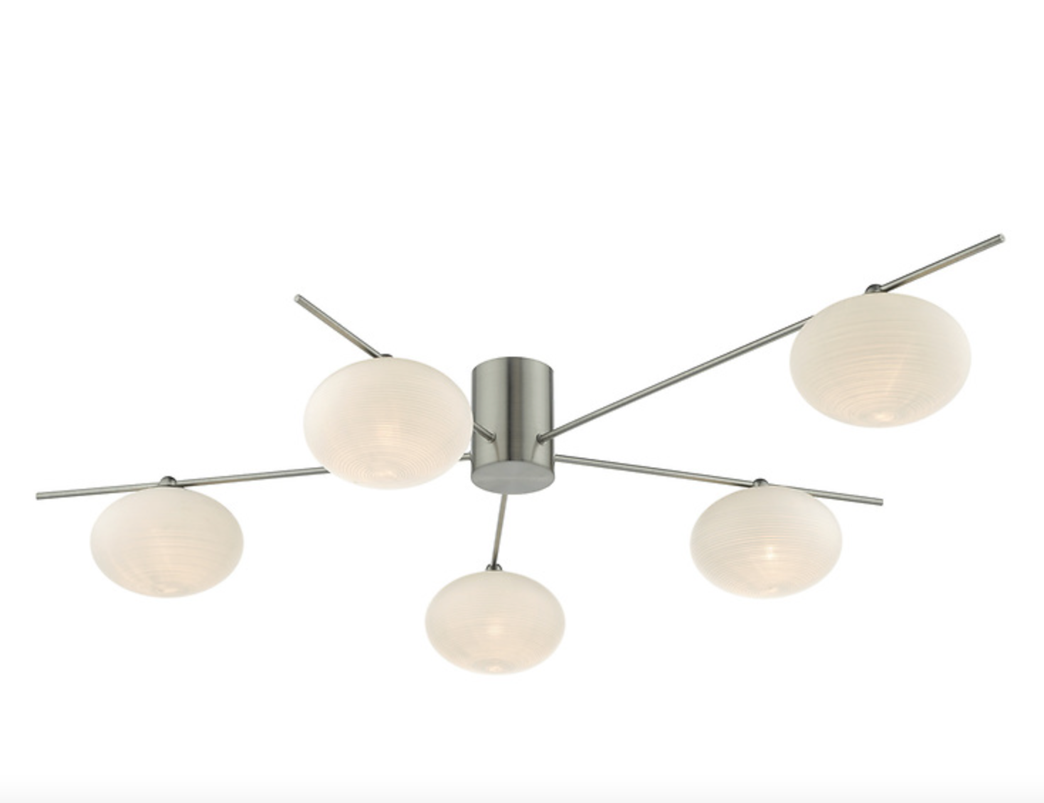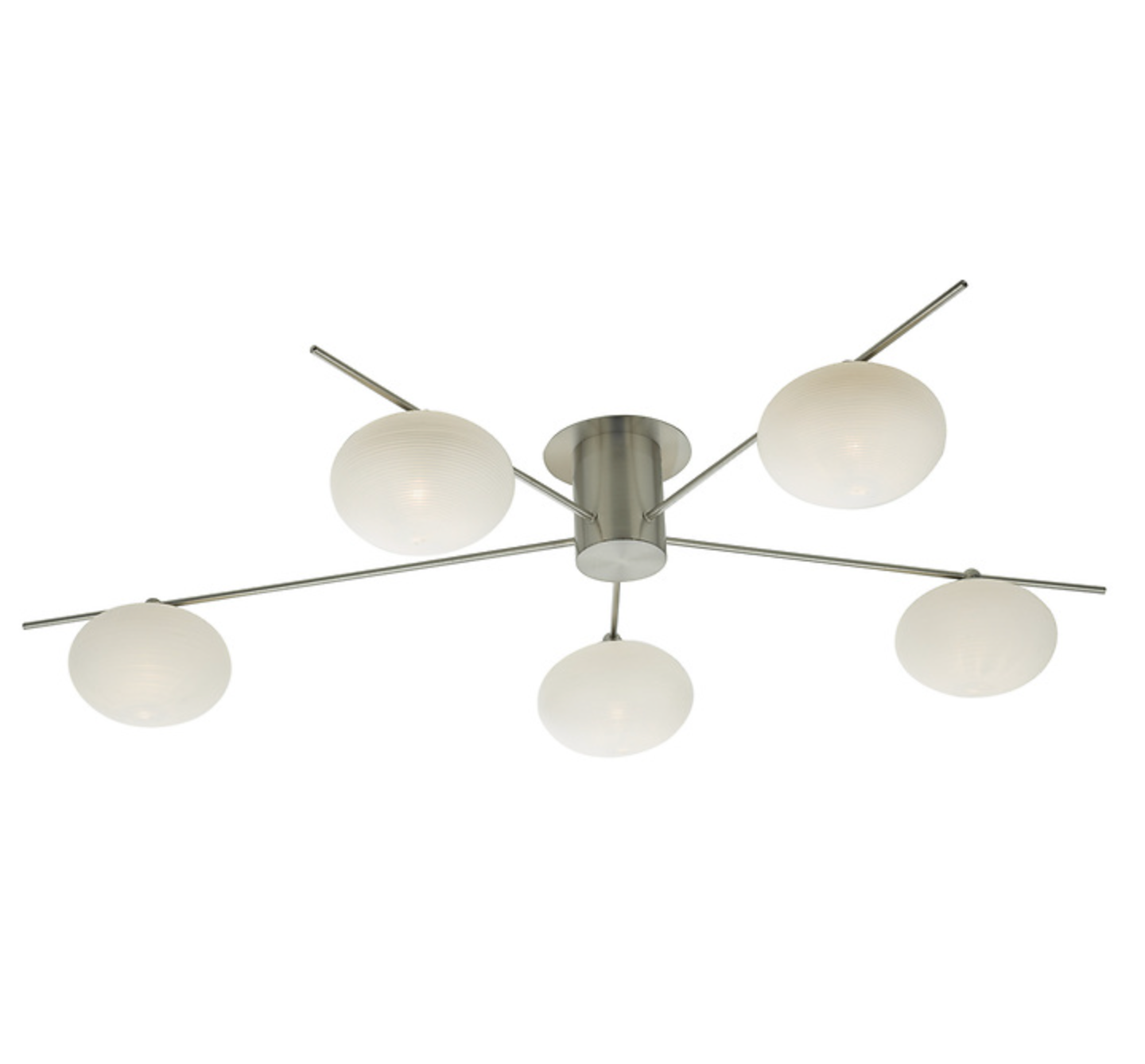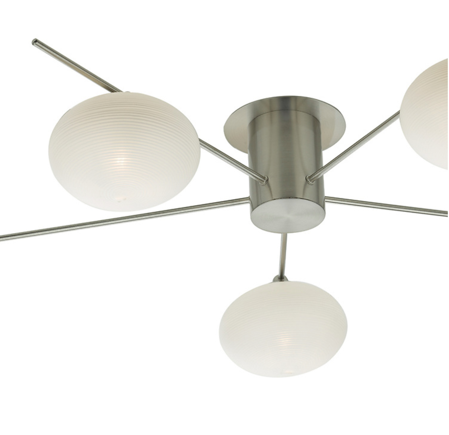 This minimalist 5 light semi-flush ceiling light is finished in satin nickel with subtle spiral textured opal glass resting on fine black arms mounted on a narrow minimalist centre body.