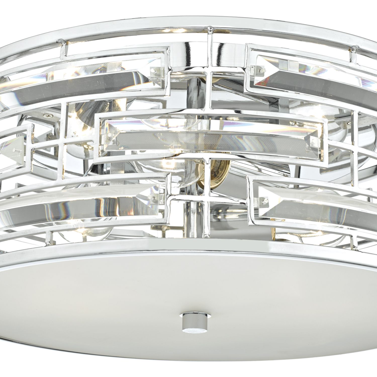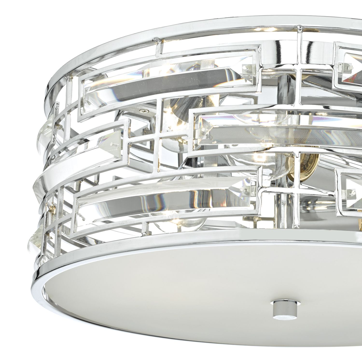 Flush ceiling light, with faceted crystal panels in a polished chrome finish frame, completed with a tempered white opal glass diffuser.