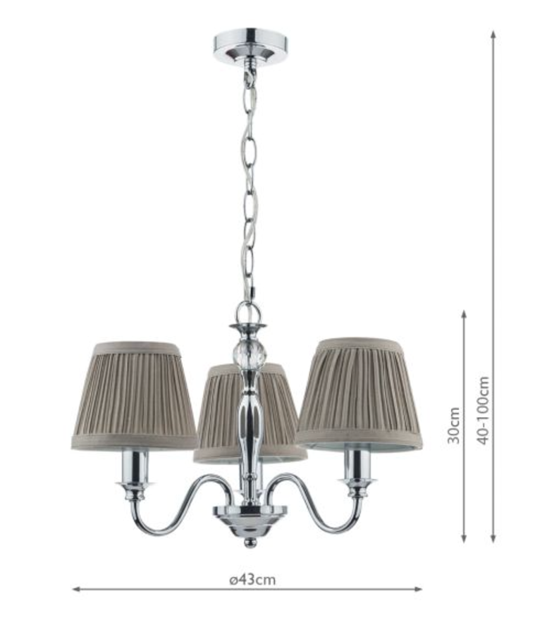 The Laura Ashley Ellis 3-armed ceiling fitting is a beautifully crafted, candelabra style chandelier. Three arms in a bright polished chrome finish flow out from the spindle-shaped body incorporating a pretty faceted glass ball. With a bright, polished chrome finish, this delightful ceiling light comes complete with light grey pleated cotton shades.