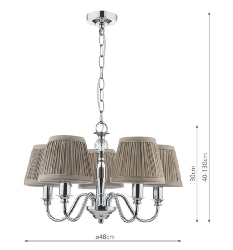 The Laura Ashley Ellis 5-armed ceiling fitting is a beautifully crafted, candelabra style chandelier. Five arms in a bright polished chrome finish flow out from the spindle-shaped body incorporating a pretty faceted glass ball. With a bright, polished chrome finish, this delightful ceiling light comes complete with light grey pleated cotton shades.