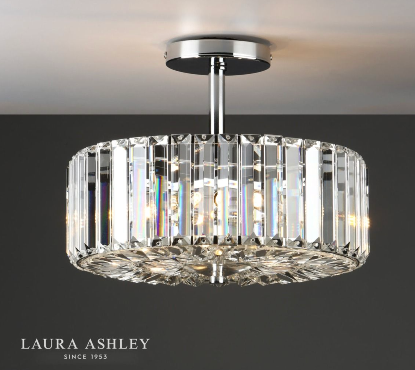 Enjoy the way light bounces off the crystal of the Fernhurst semi-flush pendant light from Laura Ashley, which simply oozes Art Deco style. Wonderfully opulent, with a circular ‘coffin’ crystal rod design (encasing 3 lights) and a bright polished chrome finish, it will introduce a polished finish to your living space.