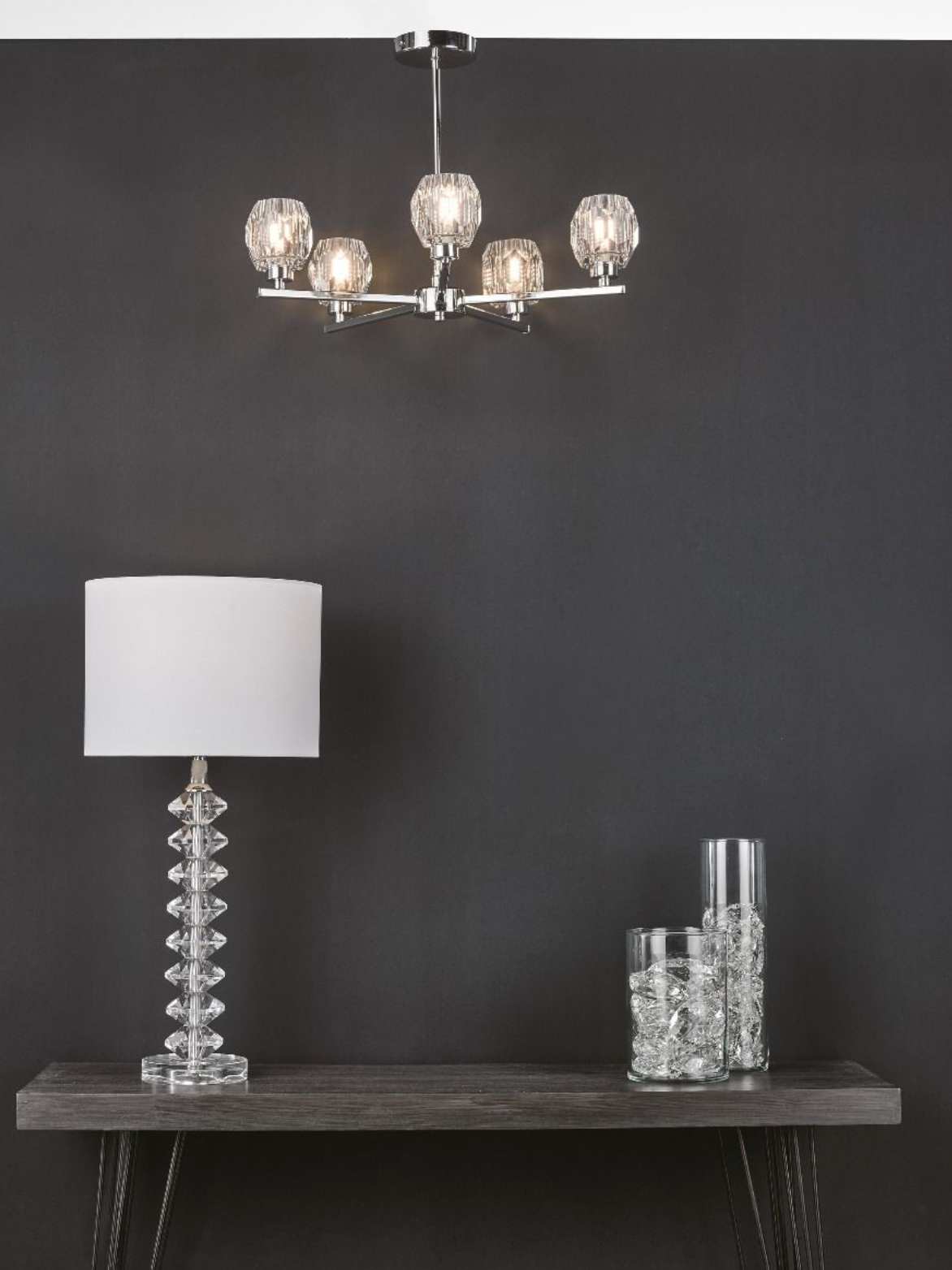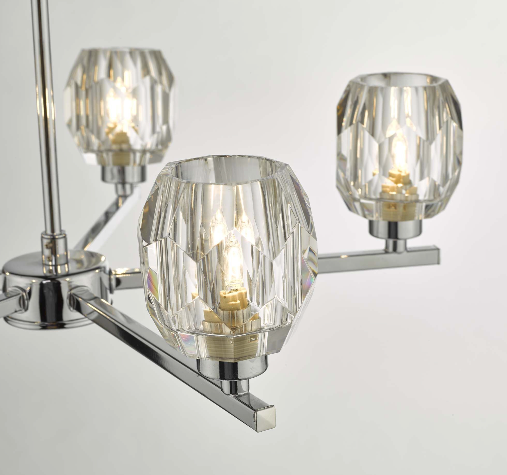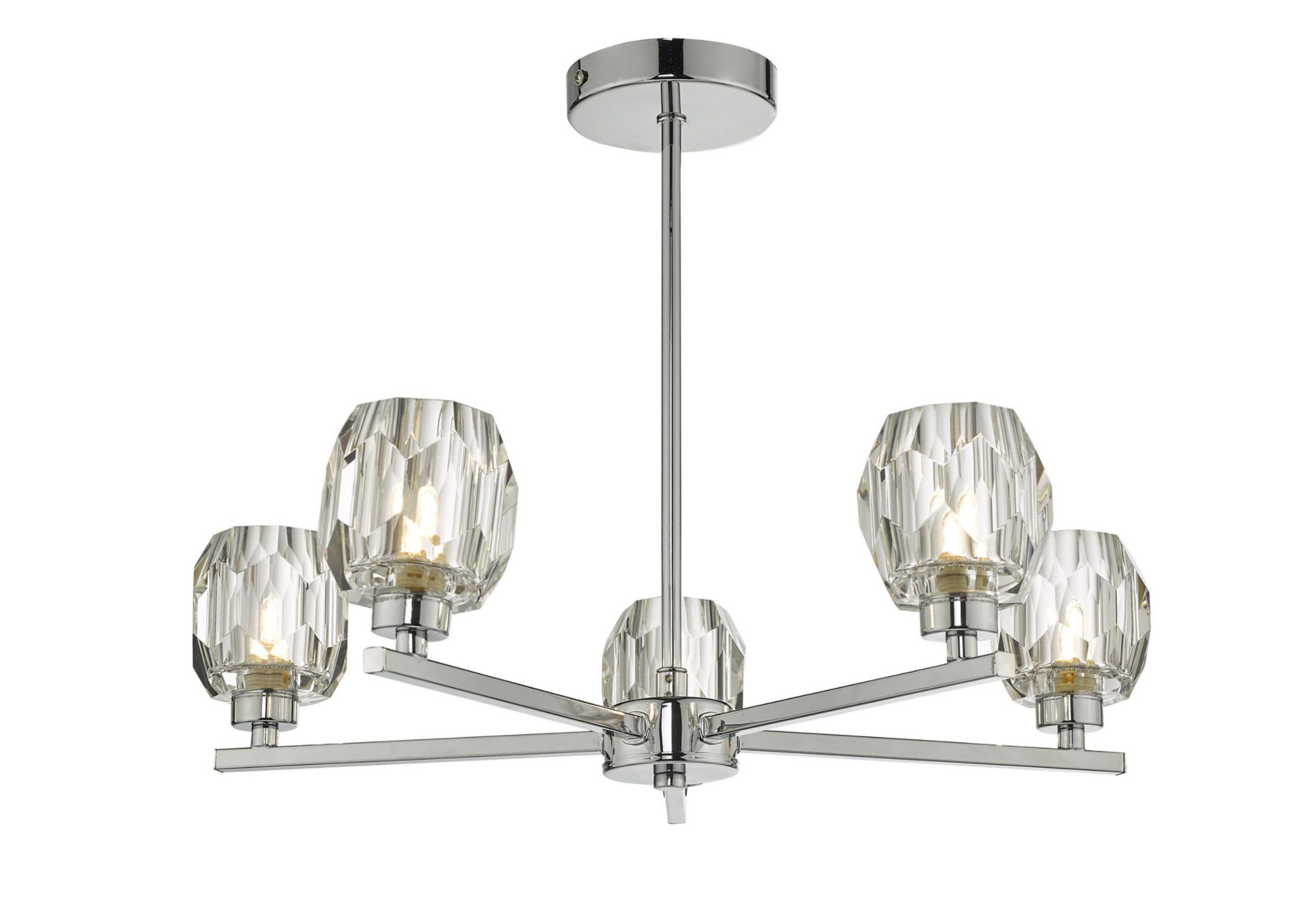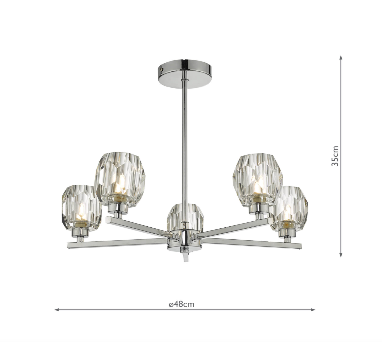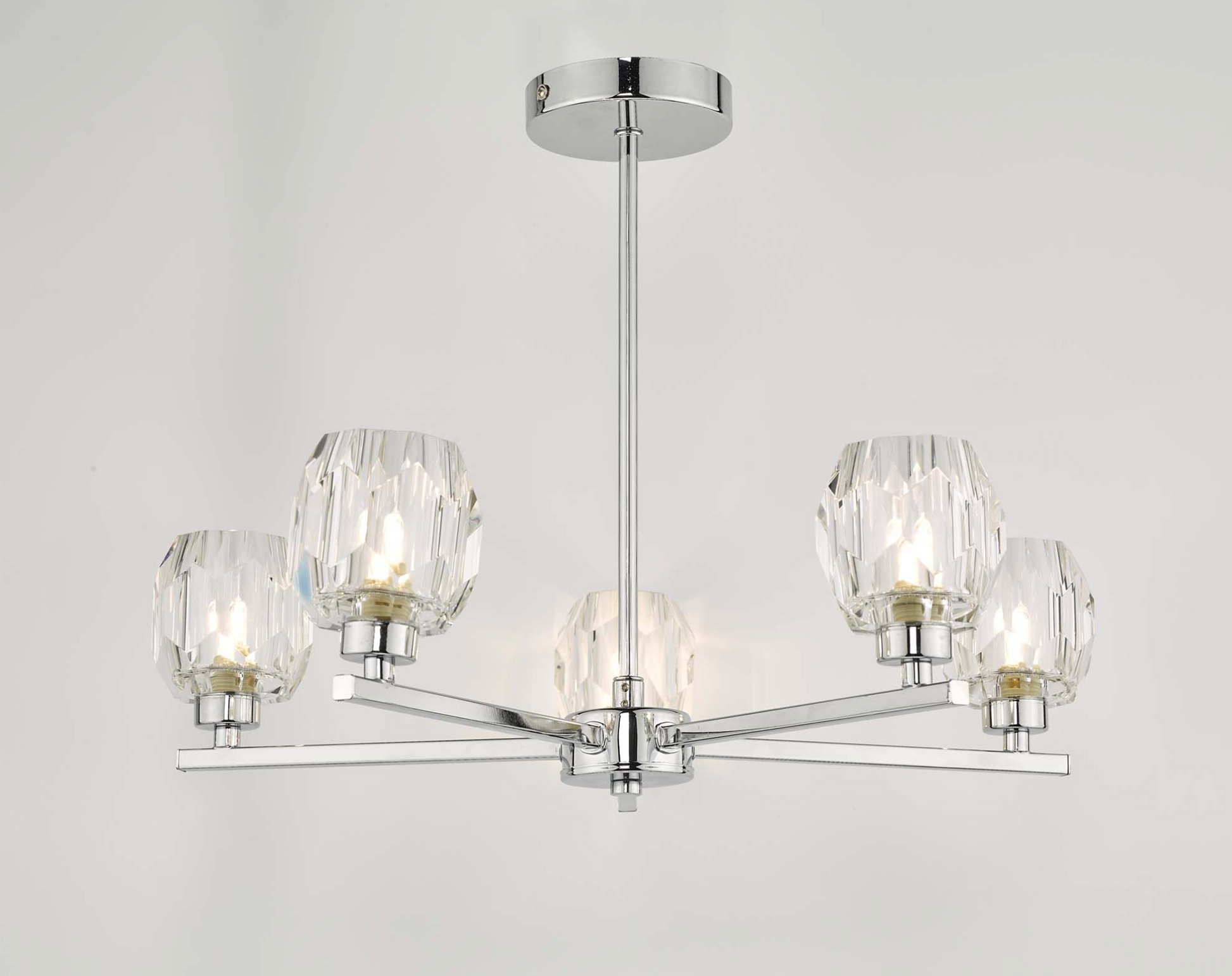 This stunning 5 arm light features beautiful faceted glass shades resting on slender square polished chrome finish arms.