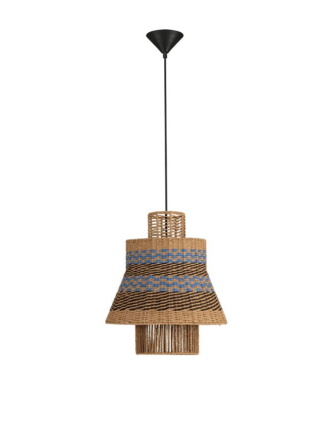 A Natural, organic pendant made from Blue & Black Rope and a smart Sandy black steal conical ceiling rose.