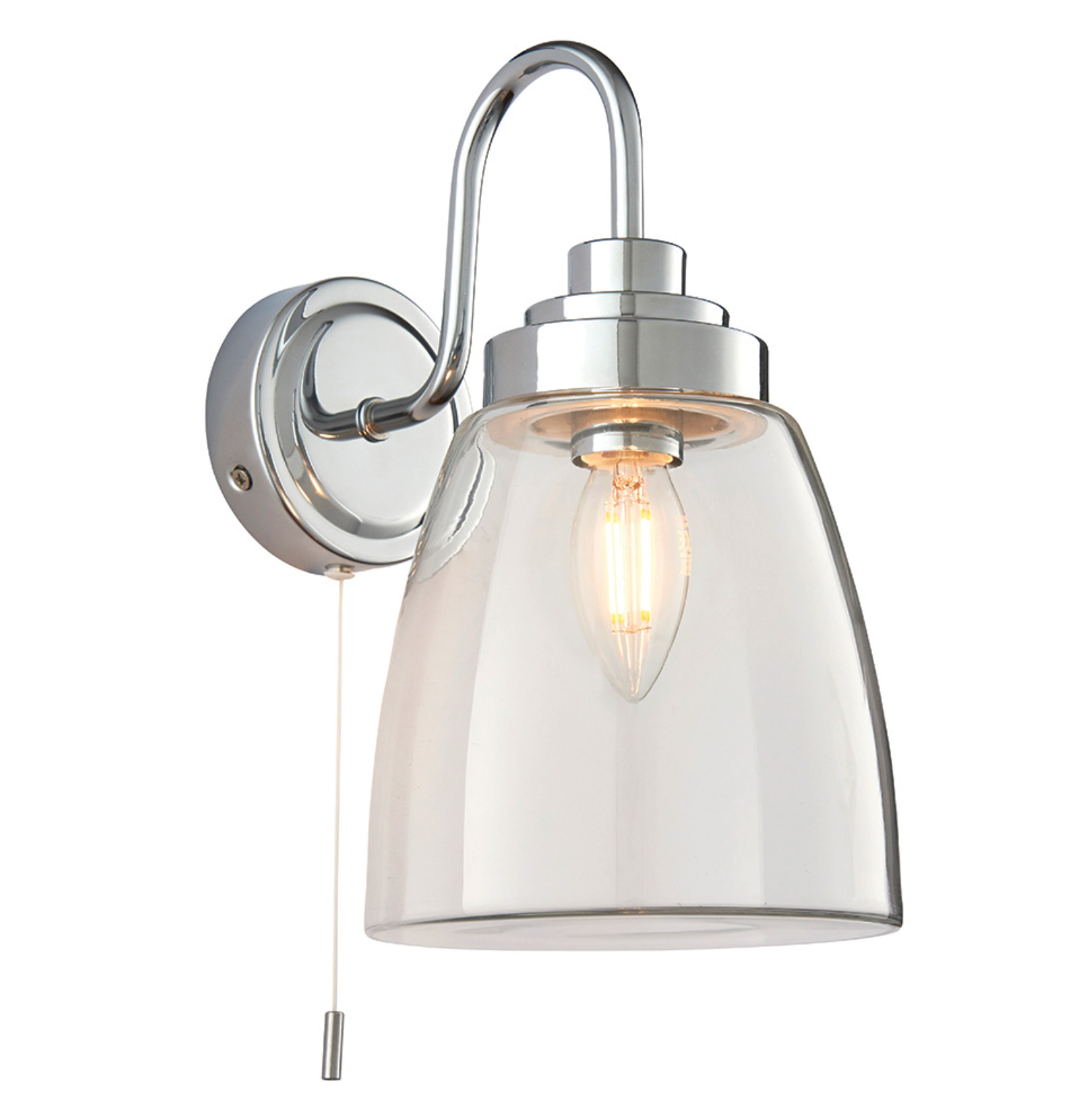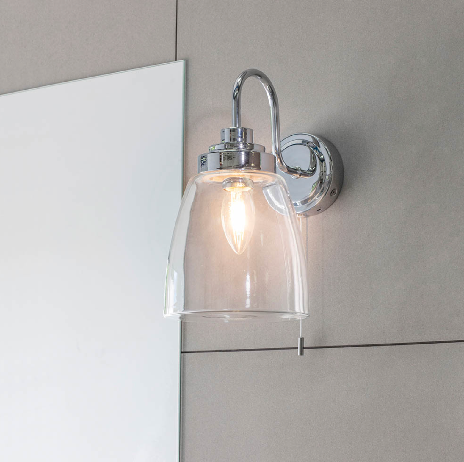 A timeless classic IP44 rated bathroom wall light. Finished in chrome with beautiful clear glass shade. With easy access pull switch, perfect for use with filament LED lamps.