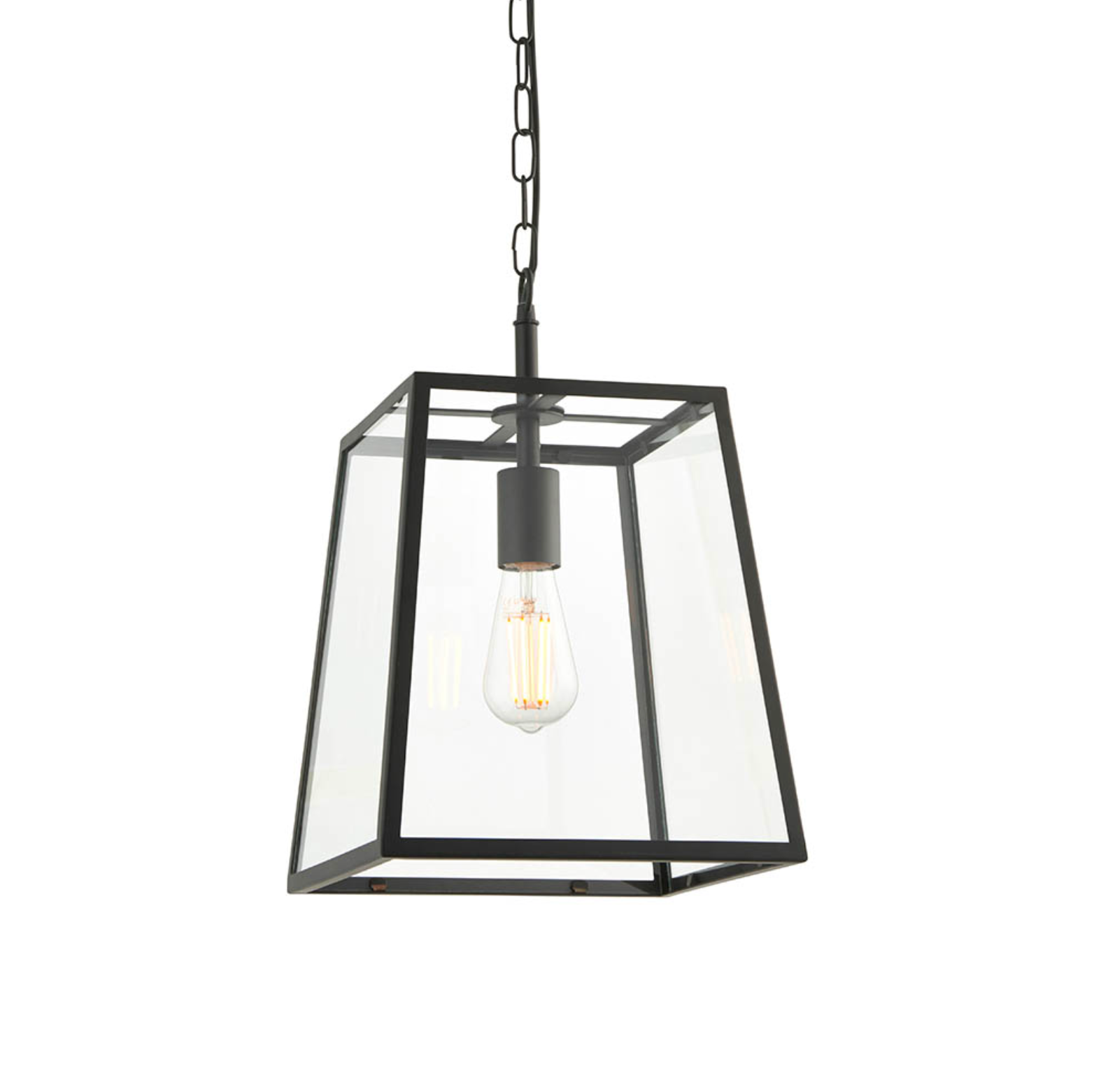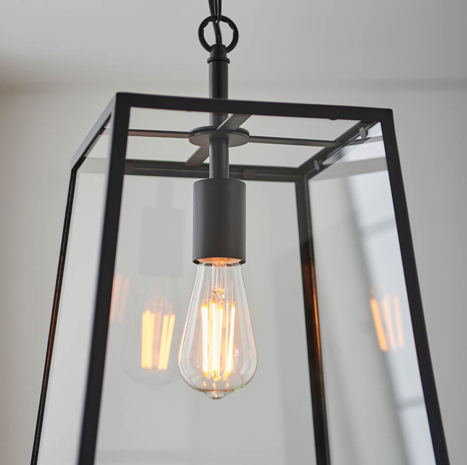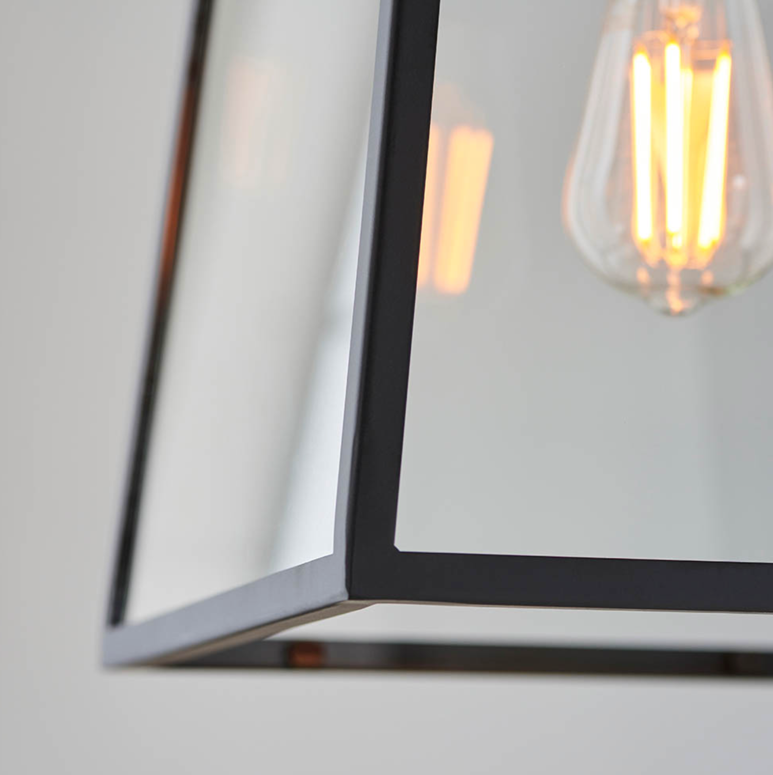 Inspired by box lanterns, this ceiling pendant is the perfect complement for today's relaxed classic interiors. Finished in matt black paint and suspended from height adjustable chain with black fabric flex. Pair with vintage style filament LED lamps that are perfectly framed by the subtle tapered metalwork and large clear glass panels.