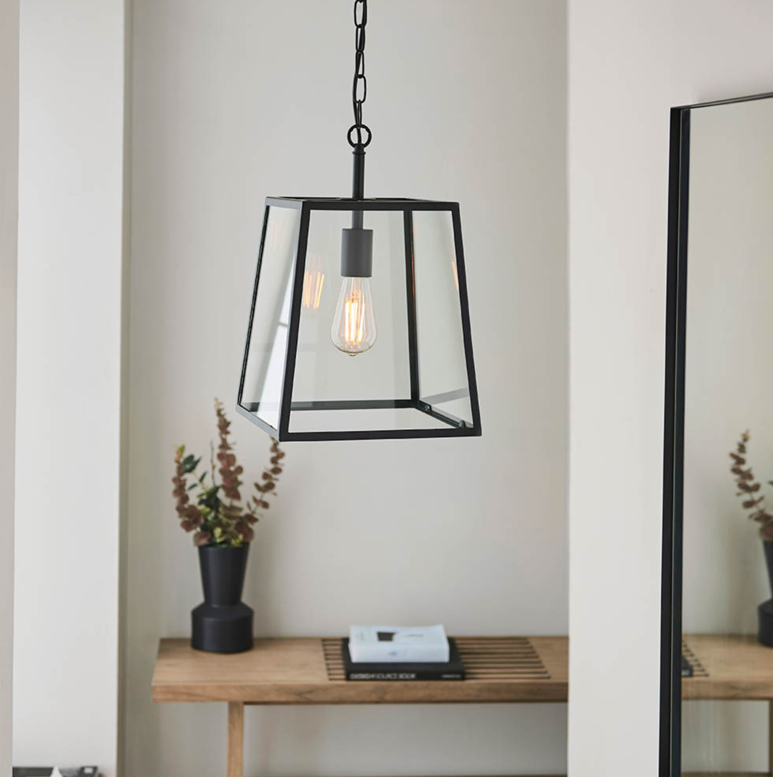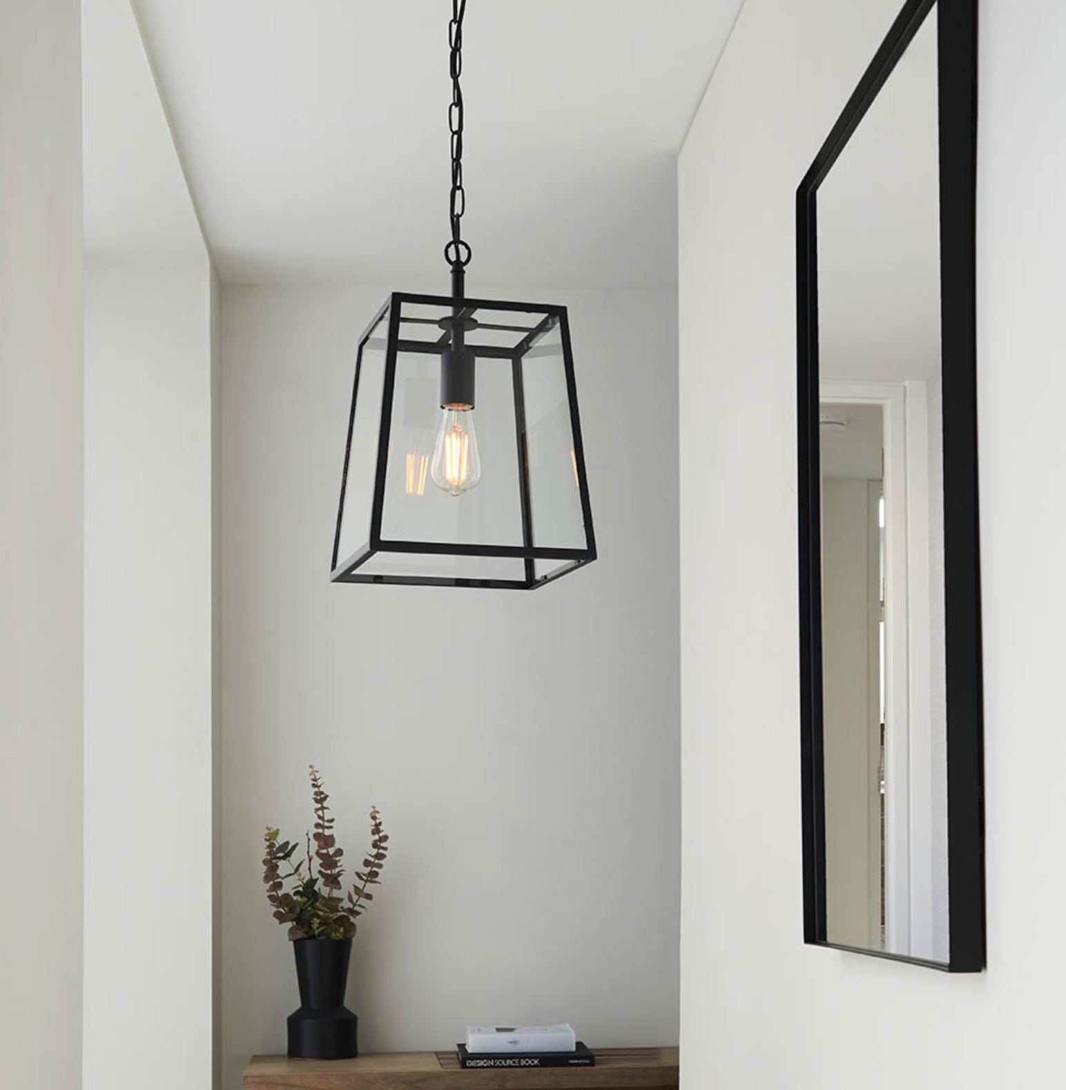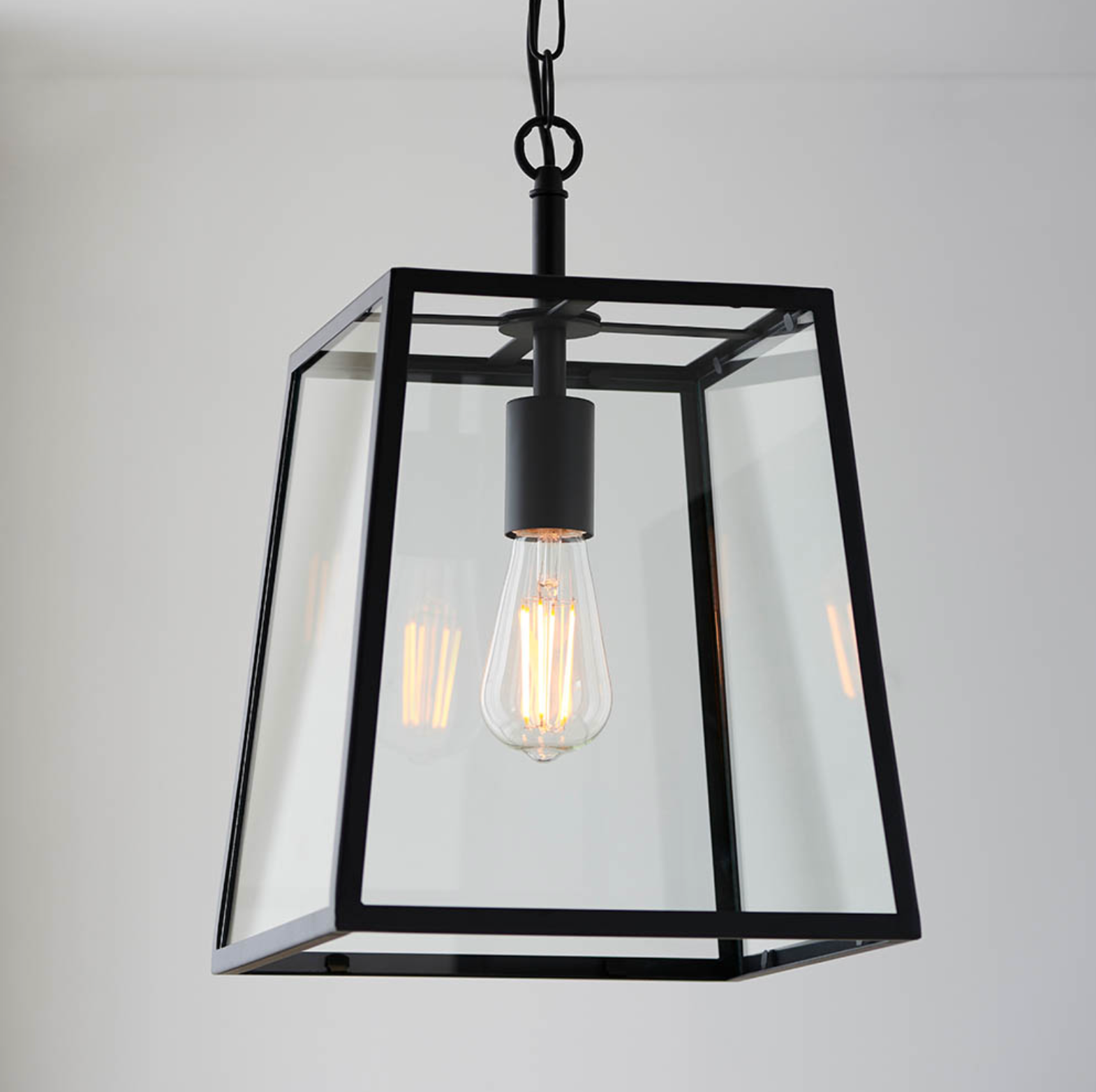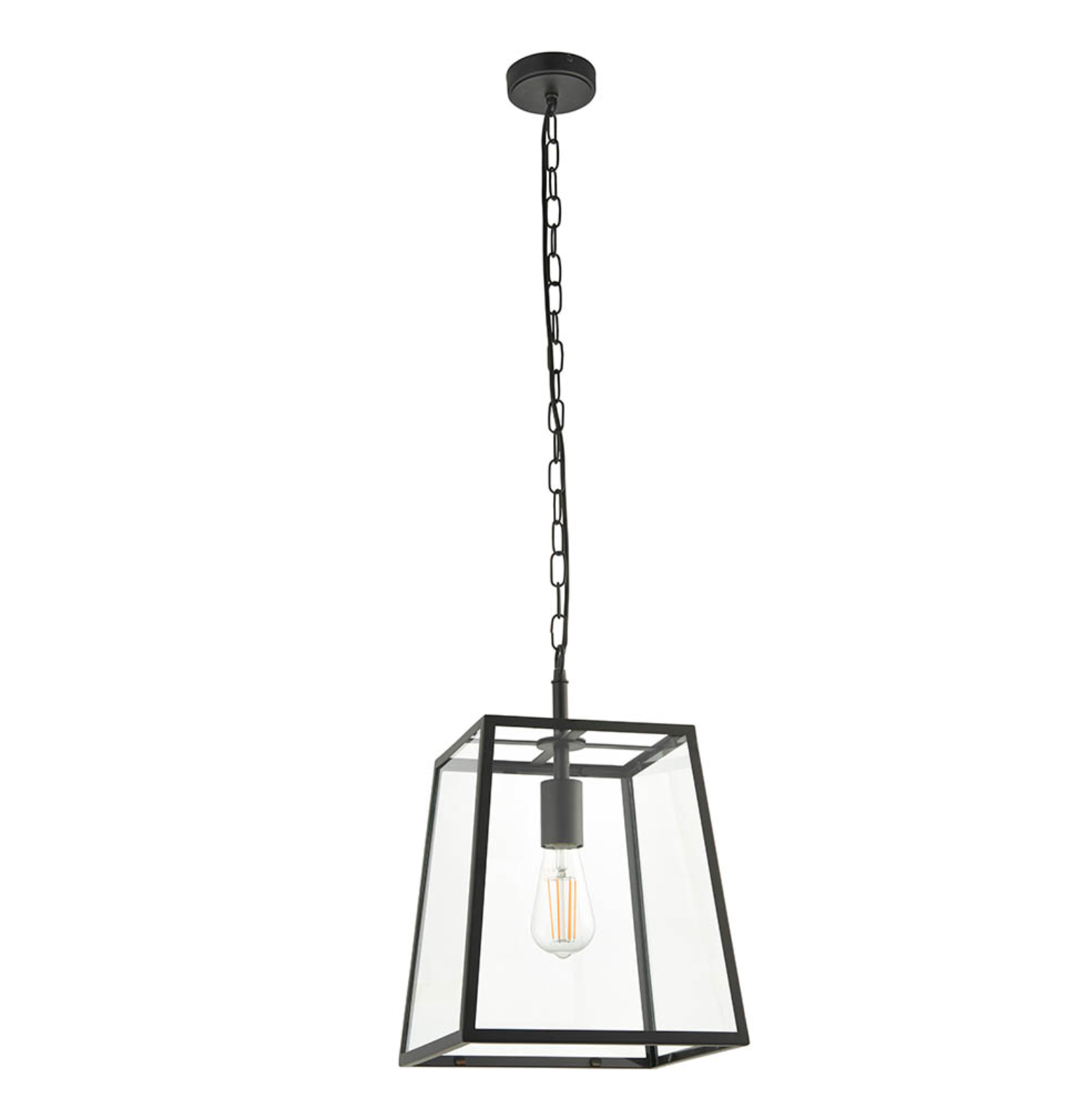 Inspired by box lanterns, this ceiling pendant is the perfect complement for today's relaxed classic interiors. Finished in matt black paint and suspended from height adjustable chain with black fabric flex. Pair with vintage style filament LED lamps that are perfectly framed by the subtle tapered metalwork and large clear glass panels.