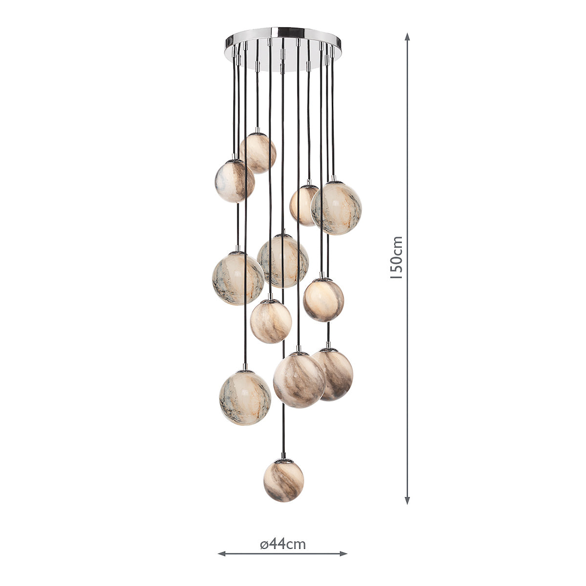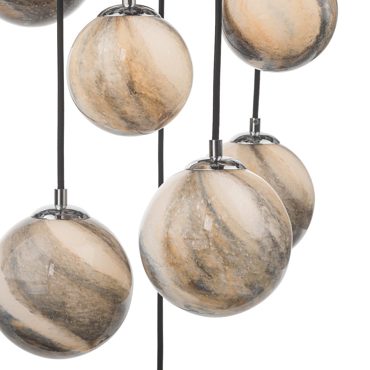 This galactic multi pendant ceiling light consists of 12 art glass shades with a subtle blue and orange marble effect inspired by the planets suspended on black cloth cable which can be shortened on installation.