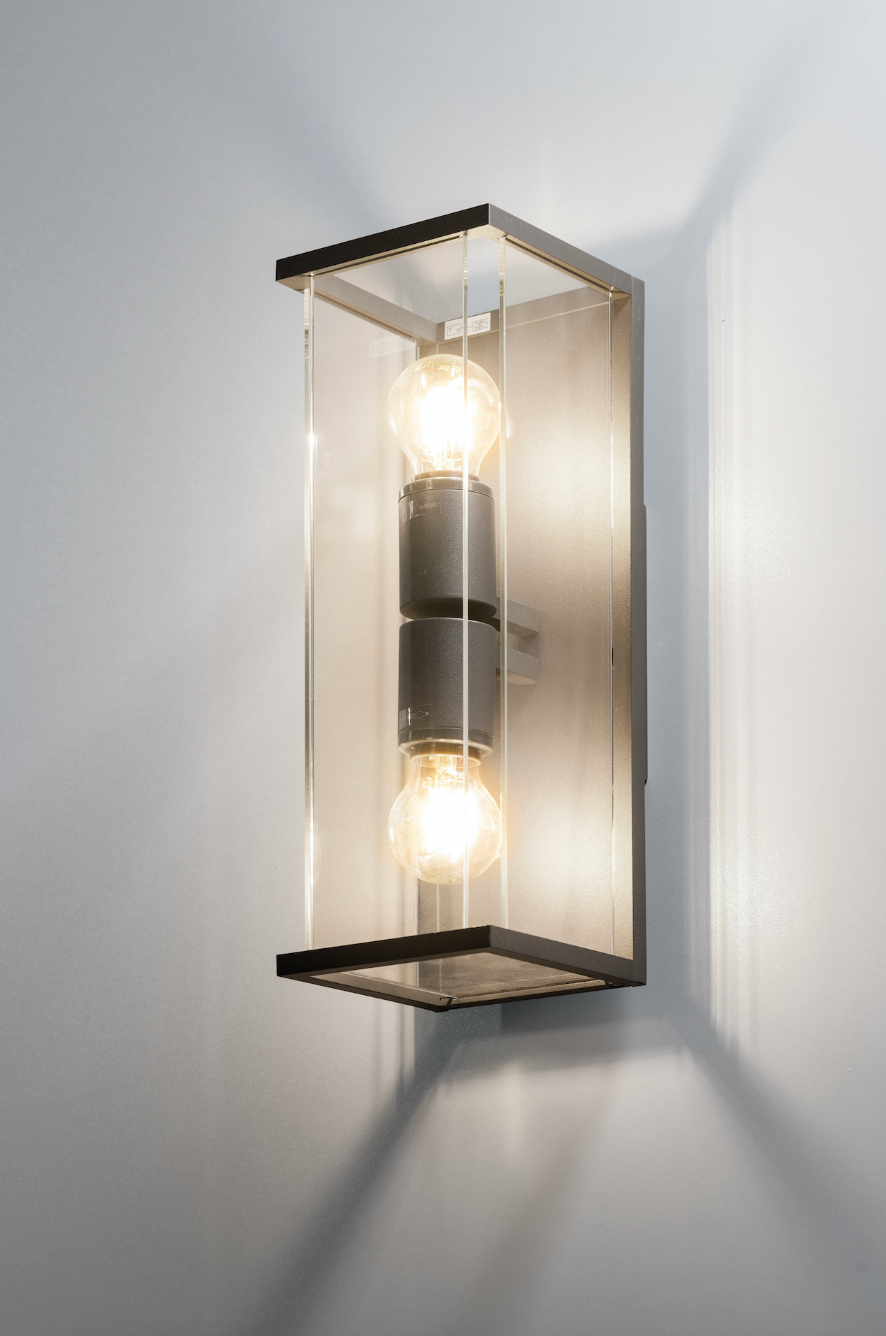 Contemporary exterior wall light featuring graphite aluminium framework and sleek glass panels to form a bold yet clean aesthetic.