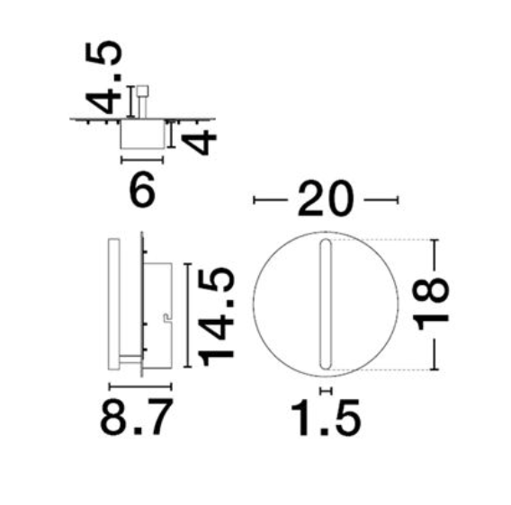 Diameter 20cm x Projection 8.7cm. Backplate 14.5cm long x 6cm wide.