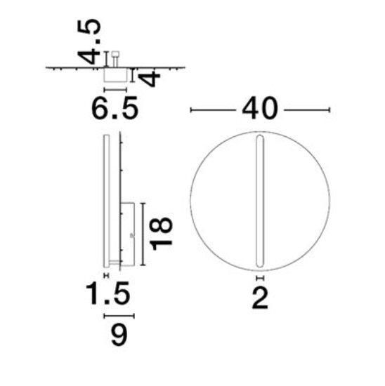 Diameter 40cm x Projection 9cm. Backplate (off centre) 18cm long x 6.5cm wide.