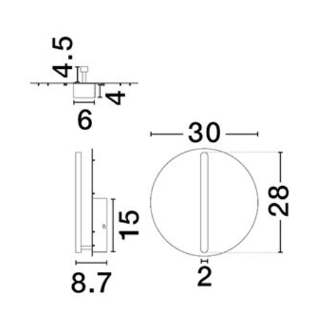 Diameter 30cm x Projection 8.7cm. Backplate (off centre) 15cm long x 6cm wide.