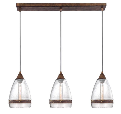 NL rustic bronze triple in line pendant with textured glass shade & bronze collar detail.