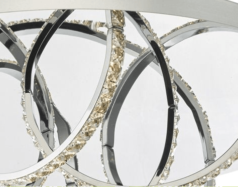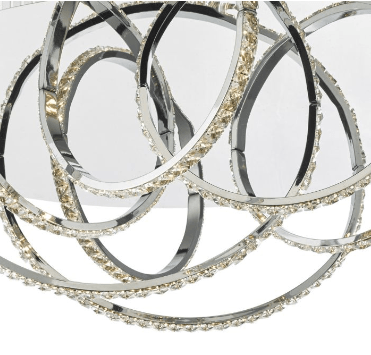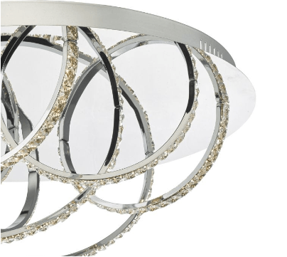 Large flush LED ceiling light in a polished chrome finish, featuring loops of LED lit crystal, creating an illusion of suspended hoops.