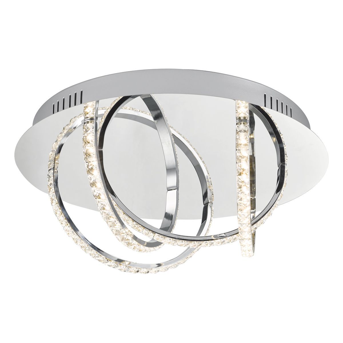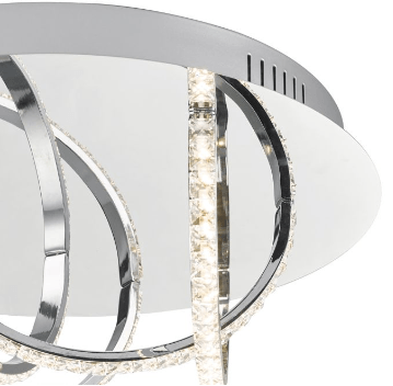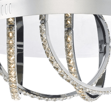 Small flush LED ceiling light in a polished chrome finish, featuring loops of LED lit crystal, creating an illusion of suspended hoops.