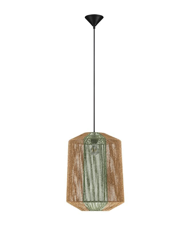 A Natural, organic pendant green rope detail and a smart Sandy black steal conical ceiling rose.