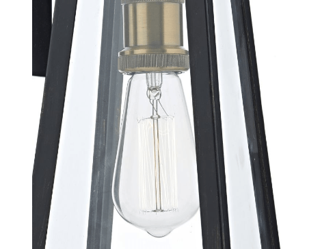 Exterior wall light in a matt black finish, with a copper bulb holder and glass panels.