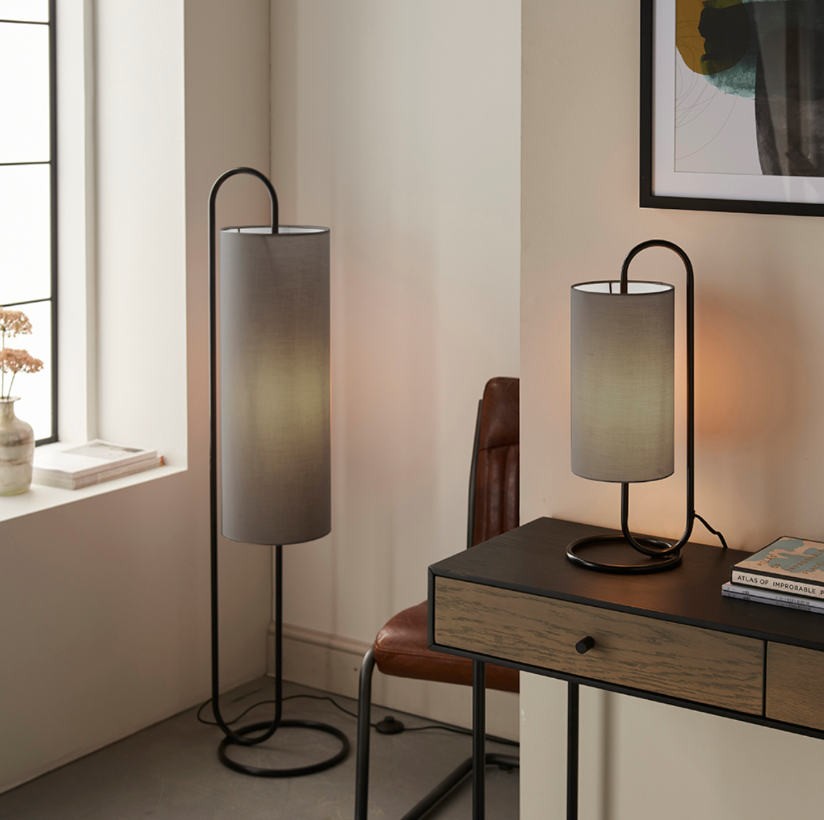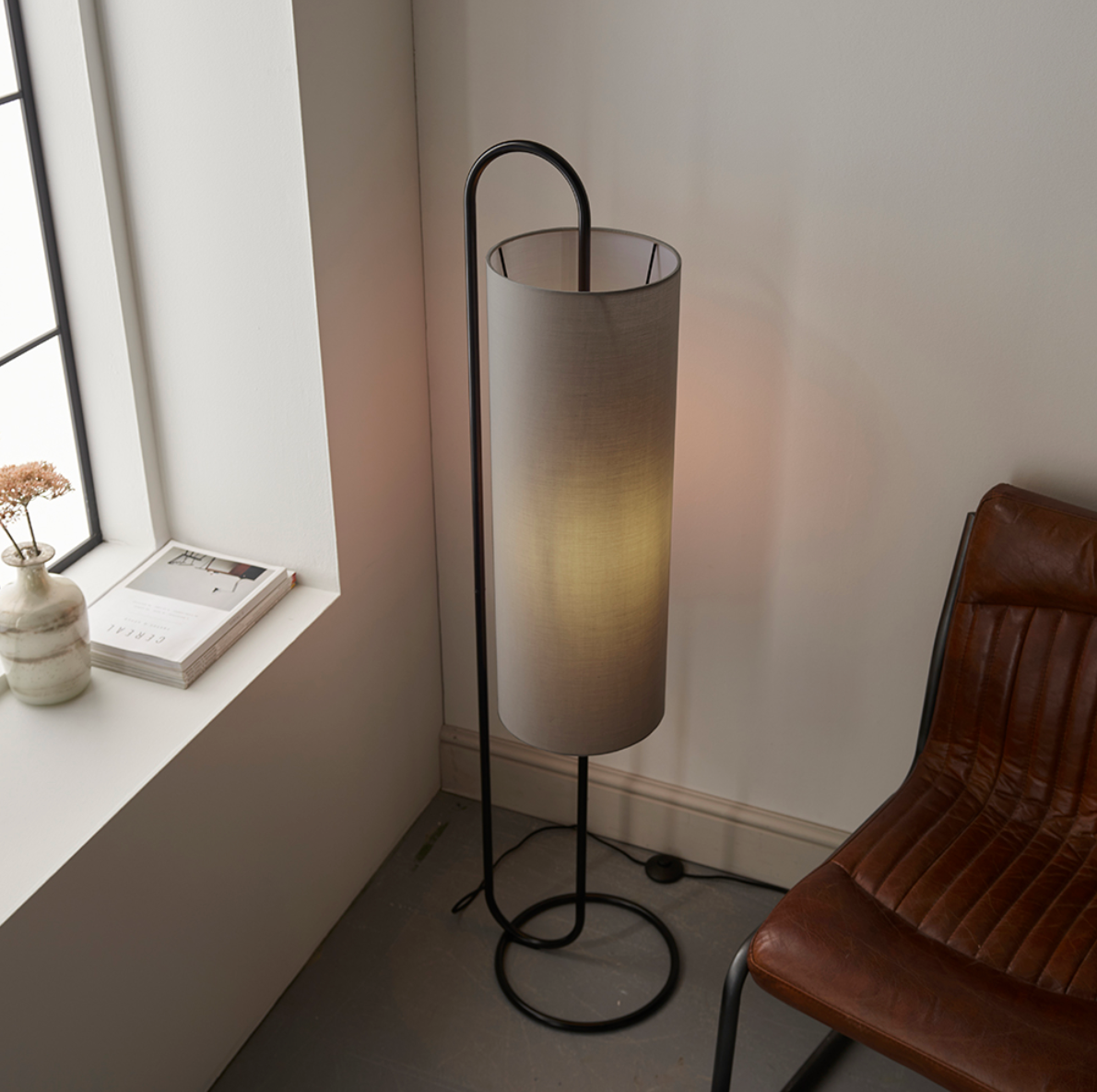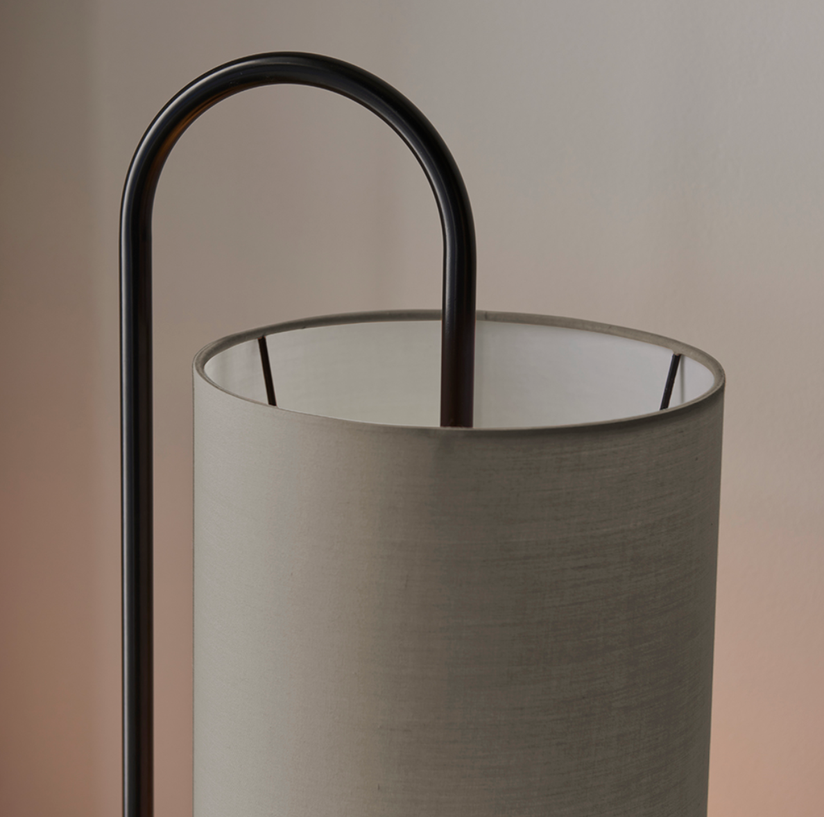 Grey fabric cylindrical shade,