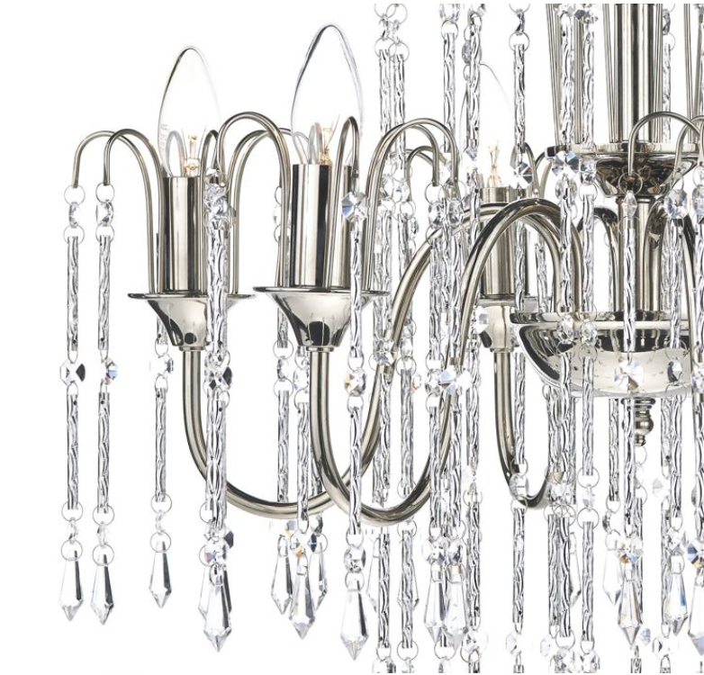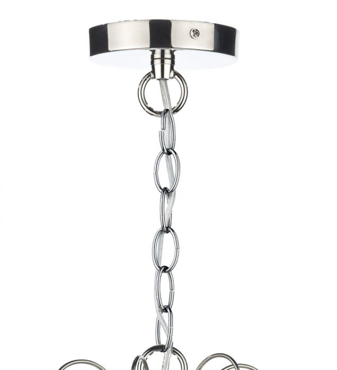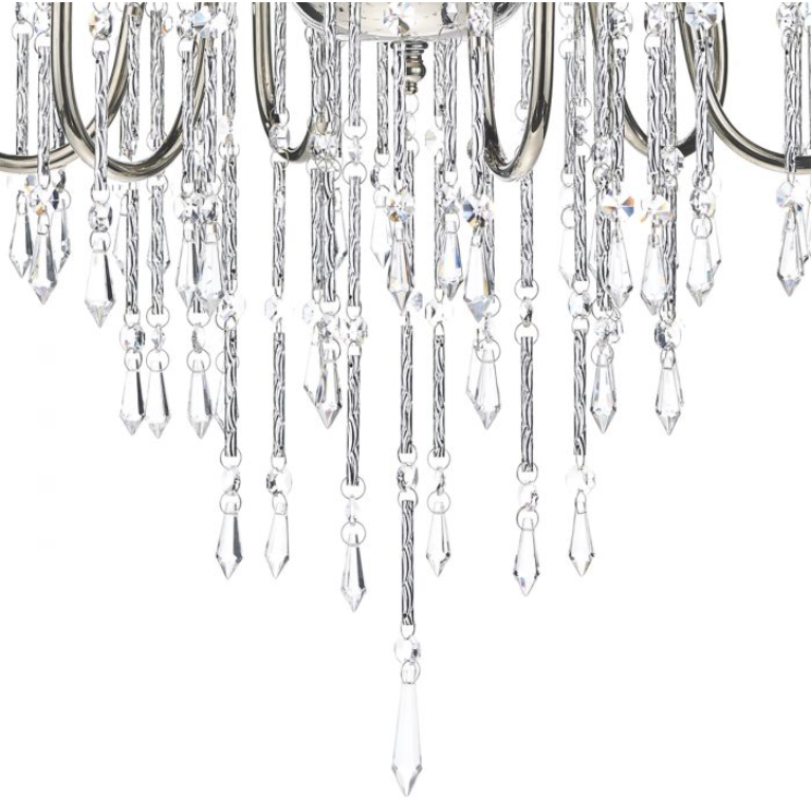 A six light polished nickel chandelier, with crystal beads hanging from polished nickel strings. Height adjustable on installation. Can be fitted flush via dual mount option.